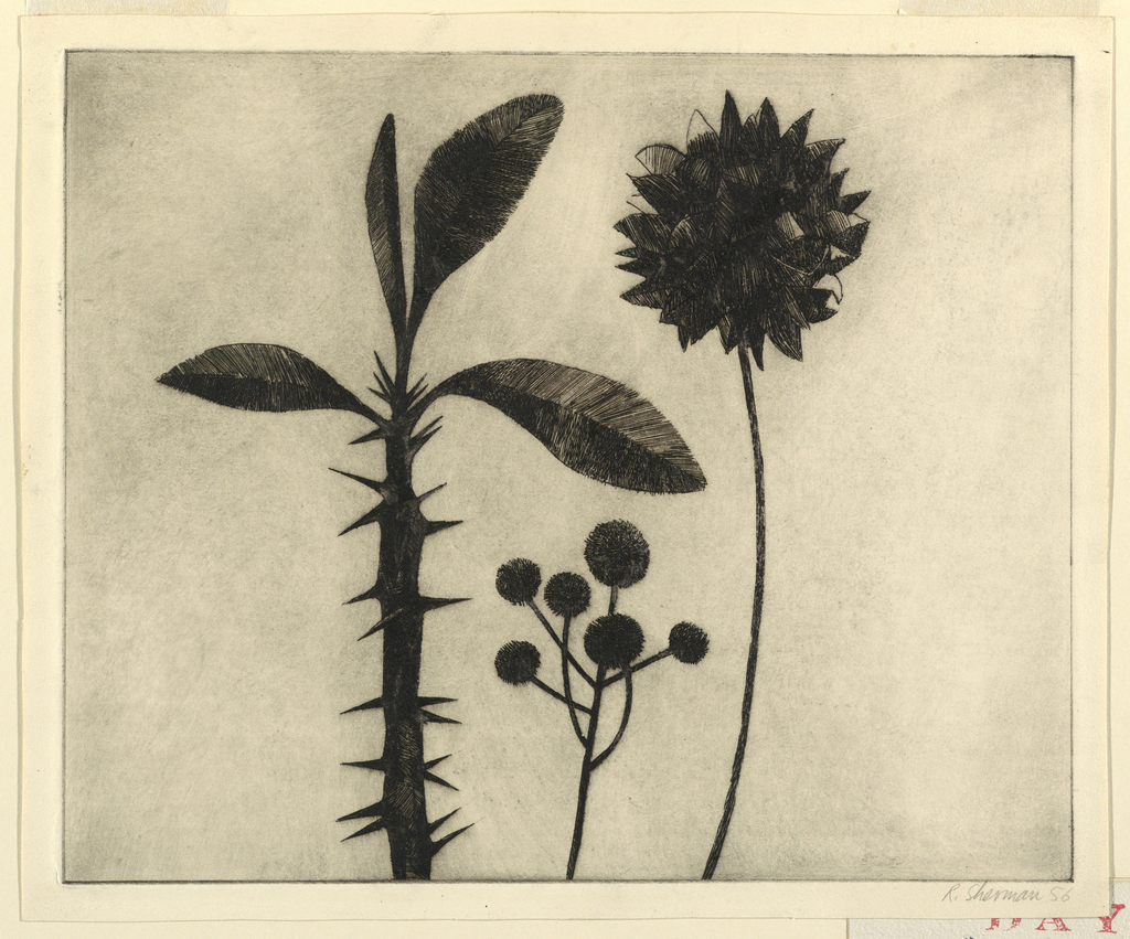 Print, Etching: Three Desert Blooms; Raymond Sherman (b. 1937); USA; black ink on cream-colored paper; H x W (Plate mark): 24.8 × 13.2 cm (9 3/4 × 5 3/16 in.) H x W (Paper): 27.2 × 32.3 cm (10 11/16 × 12 11/16 in.); 1957-104-3