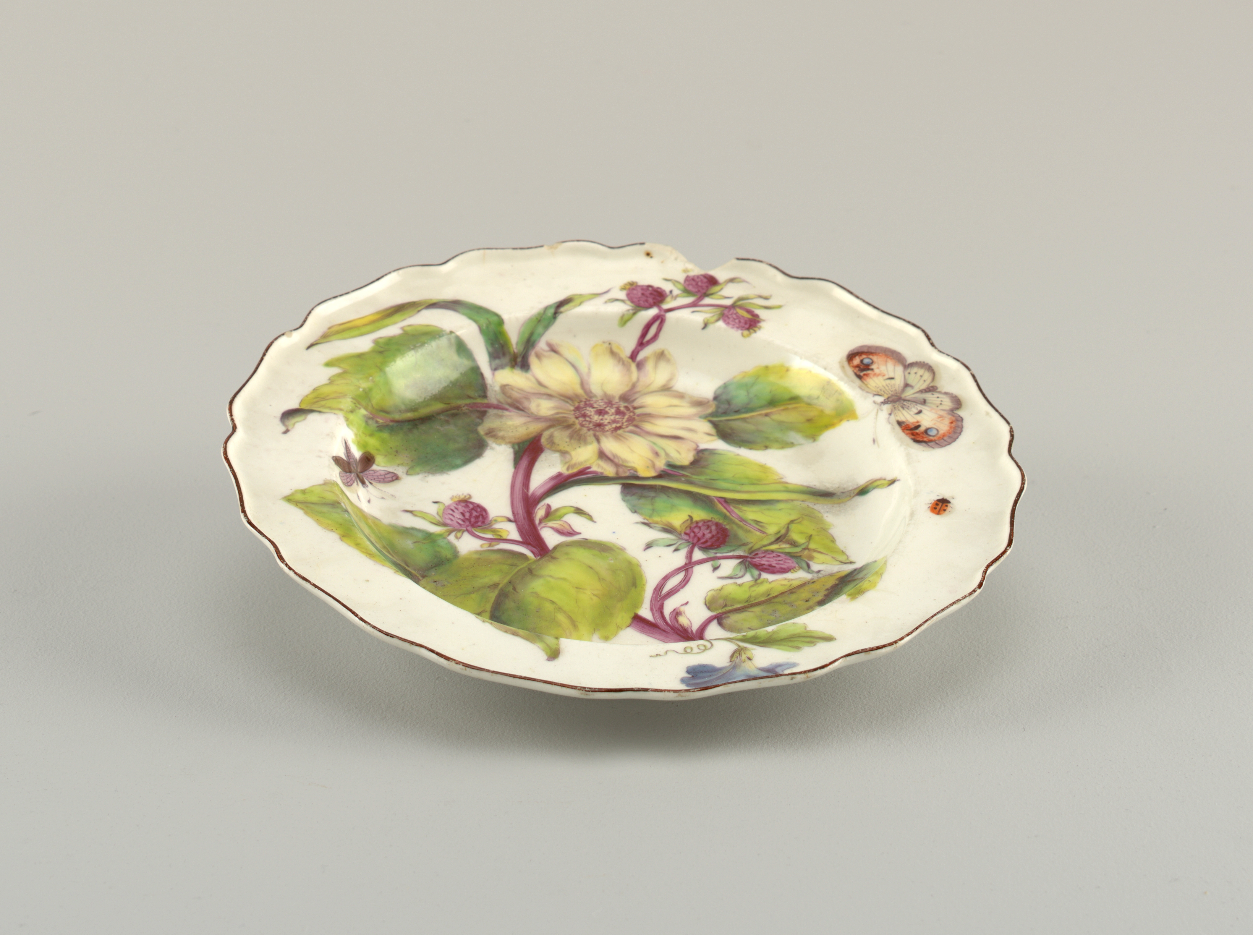This is a plate. It was manufactured by Chelsea Porcelain Manufactory and after Georg Dionysius Ehret. It is dated 1754–1758 and we acquired it in 1957. Its medium is soft paste porcelain, vitreous enamel. It is a part of the Product Design and Decorative Arts department.