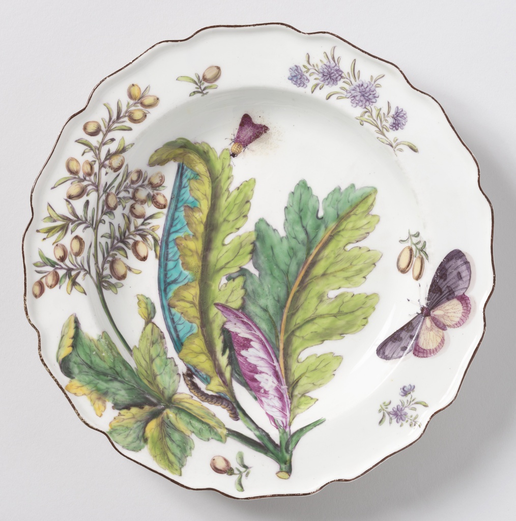 This is a plate. It was manufactured by Chelsea Porcelain Manufactory and after Georg Dionysius Ehret. It is dated 1754–1758 and we acquired it in 1957. Its medium is soft paste porcelain, vitreous enamel. It is a part of the Product Design and Decorative Arts department.