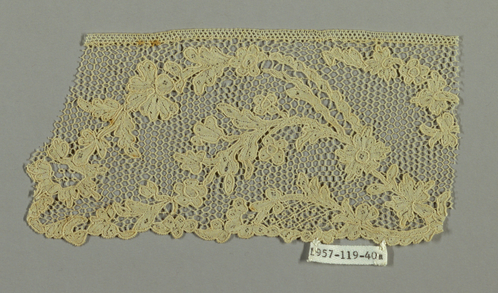 This is a Fragment. We acquired it in 1957. Its medium is linen and its technique is needle lace, late 17th to early 19th c, 6 sided. It is a part of the Textiles department.