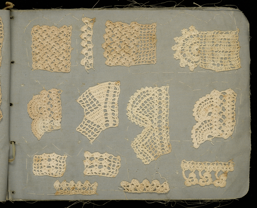 This is a Scrapbook of crochet samples. It is dated late 19th century and we acquired it in 1957. Its medium is linen, cotton and its technique is crochet. It is a part of the Textiles department.