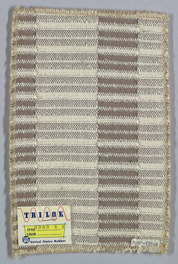Sample, Trilok No. 5003; Manufactured by U.S. Rubber (Textile Division); USA; 2-ply viscose rayon, linen, clear polyethylene warp; 2-ply viscose rayon weft; H x W: 23.4 × 15.5 cm (9 3/16 × 6 1/8 in.); 1957-135-2