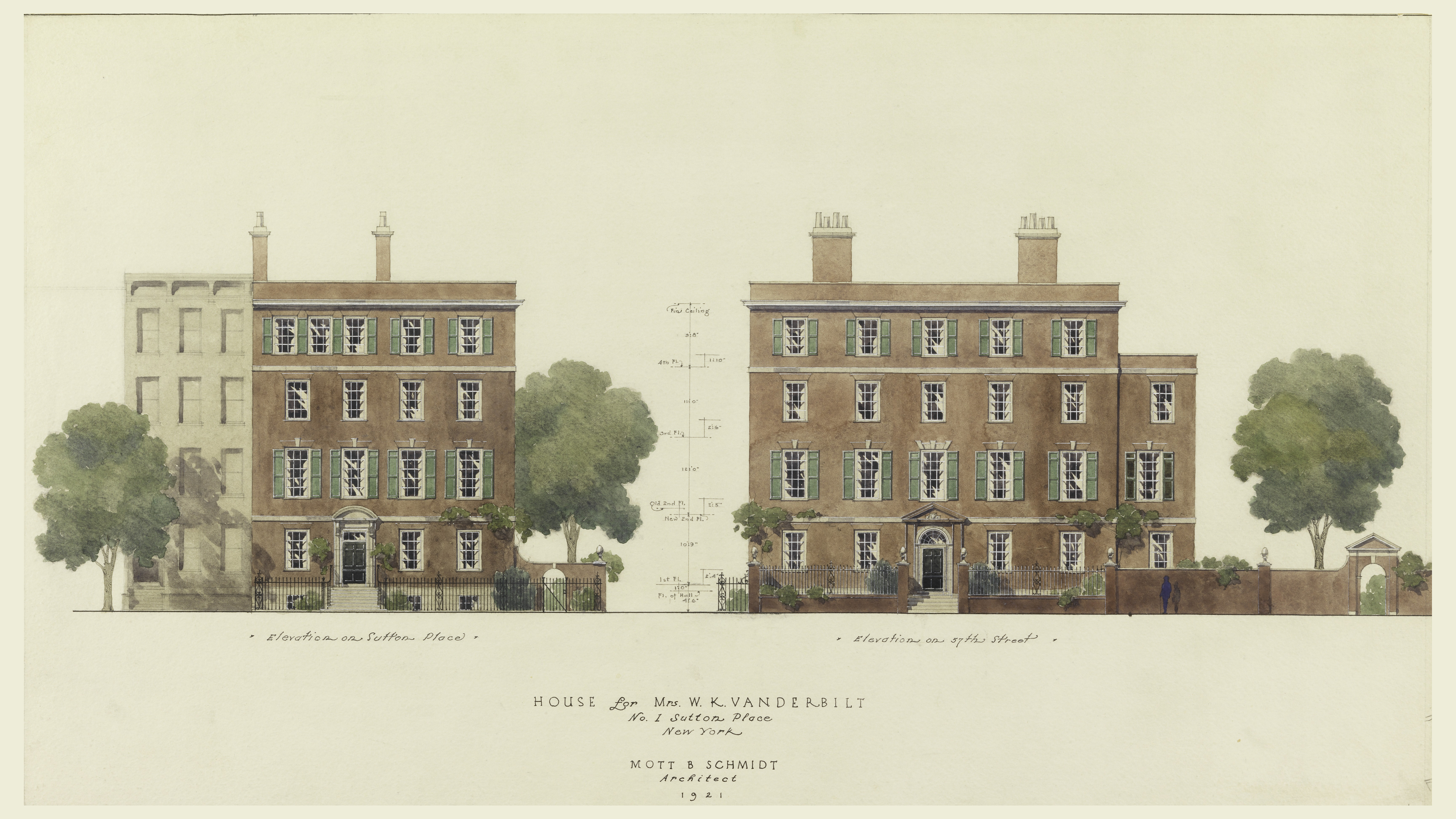Drawing, Rendering of One Sutton Place, New York City; Architect: Mott Brooshovft Schmidt (American, 1889 - 1977); USA; graphite, pen and black ink, brush and watercolor on white paper mounted on board; 40.1 x 70.9 cm (15 13/16 x 27 15/16 in.); 1957-146-1