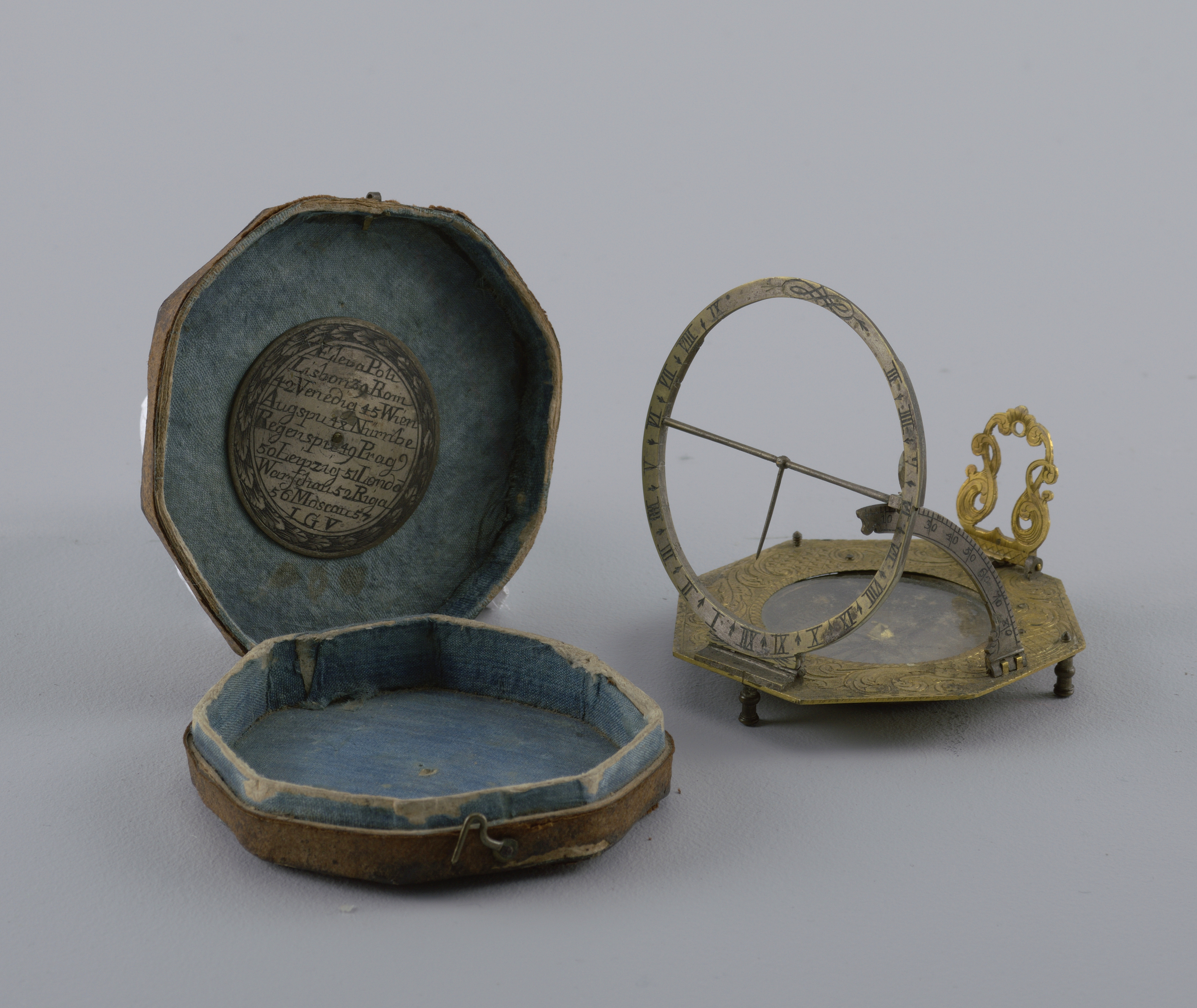 This is a Traveling sundial and compass. It is dated early–mid-18th century and we acquired it in 1957. Its medium is brass, steel, paper, leather, silk. It is a part of the Product Design and Decorative Arts department.