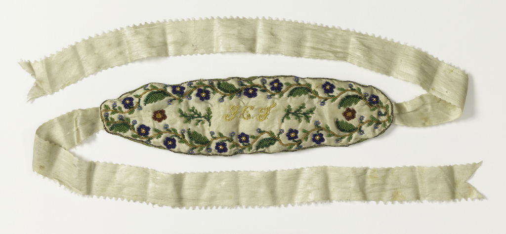 This is a Garter. It is dated 19th century and we acquired it in 1957. Its medium is silk, glass beads and its technique is embroidered beadwork. It is a part of the Textiles department.