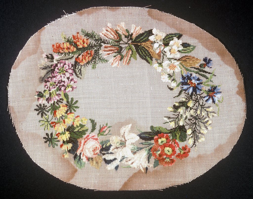 This is a Textile. It is dated 19th century and we acquired it in 1957. Its medium is silk, linen and its technique is counted stitch embroidery. It is a part of the Textiles department.