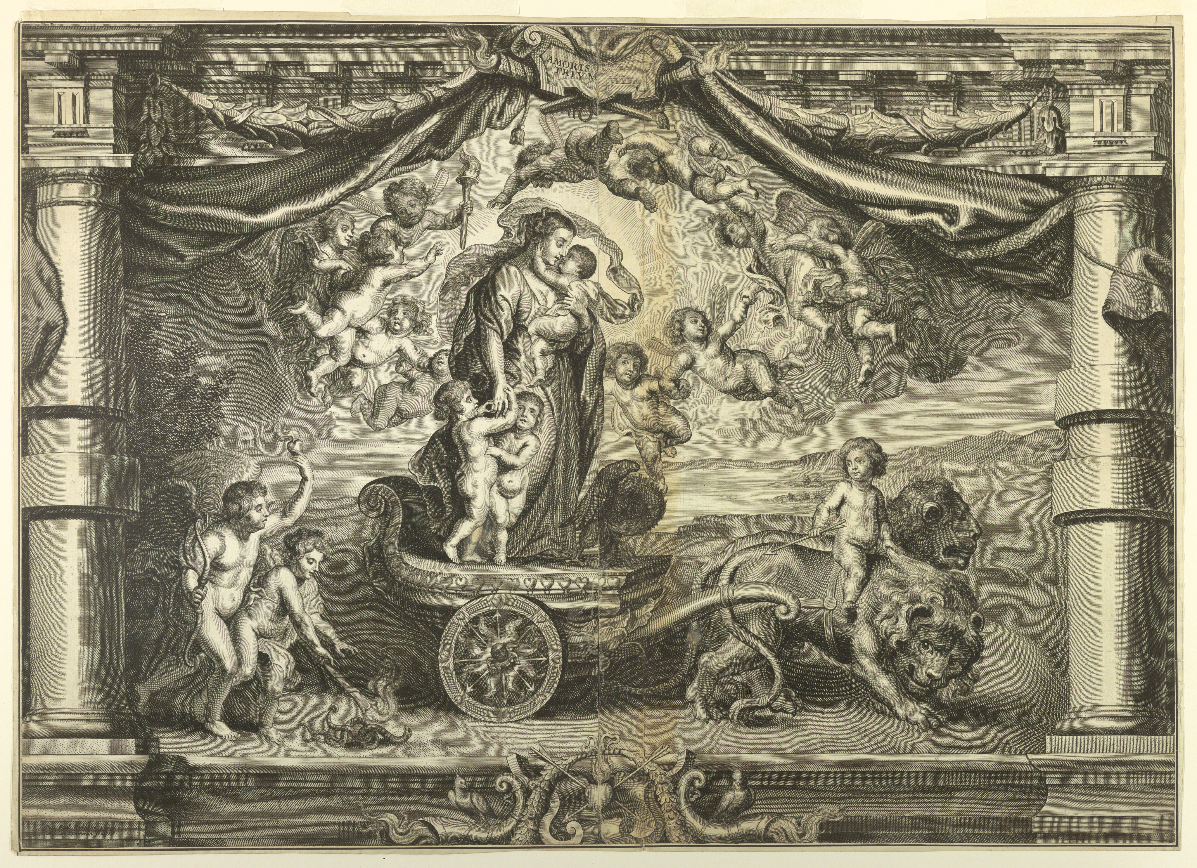 Inscribed atop top: "AMORIA TRIUM" (in a ribbon). Lower left: "Pet. Paul Rubbens invenit/Adrien Lammelin sculpsit."