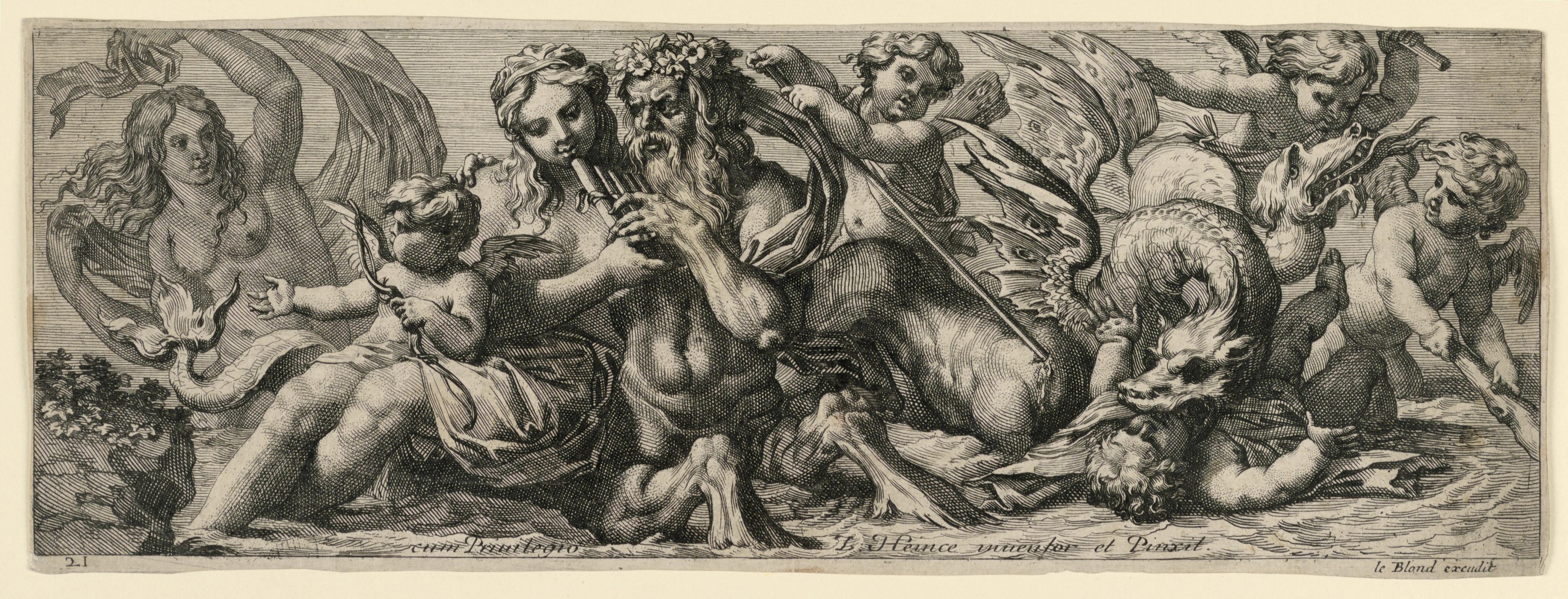 Print, Ornamental Frieze with Sea Nymphs; Print Maker: Michel Le Blon (German, 1587 - 1656); After Zacharie Heince (French, 1611 - 1669); France; engraving on paper; 13.6 × 37.8 cm (5 3/8 × 14 7/8 in.); 1957-41-70