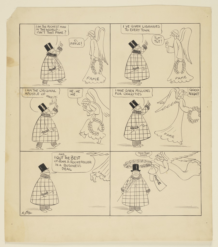This is a Drawing. It was subject: Andrew Carnegie. It is dated ca. 1910 and we acquired it in 1957. Its medium is pen and black ink on cream illustration board. It is a part of the Drawings, Prints, and Graphic Design department.