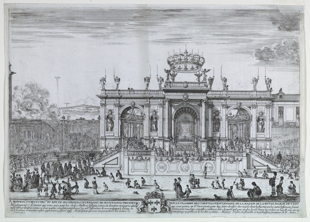 Print, The Exposition of the Holy Sacrament, Attended by Louis XIV and His Mother, Anne of Austria; Designed by Stefano della Bella (Italian, 1610–1664); Italy; engraving with black ink on white paper; Platemark: 33.8 × 47.8 cm (13 5/16 × 18 13/16 in.) H x W: 35 × 48.8 cm (13 3/4 × 19 3/16 in.) Mat: 55.9 × 71.1 cm (22 × 28 in.); Museum purchase through gift of the Estate of David Wolfe Bishop; 1957-81-1
