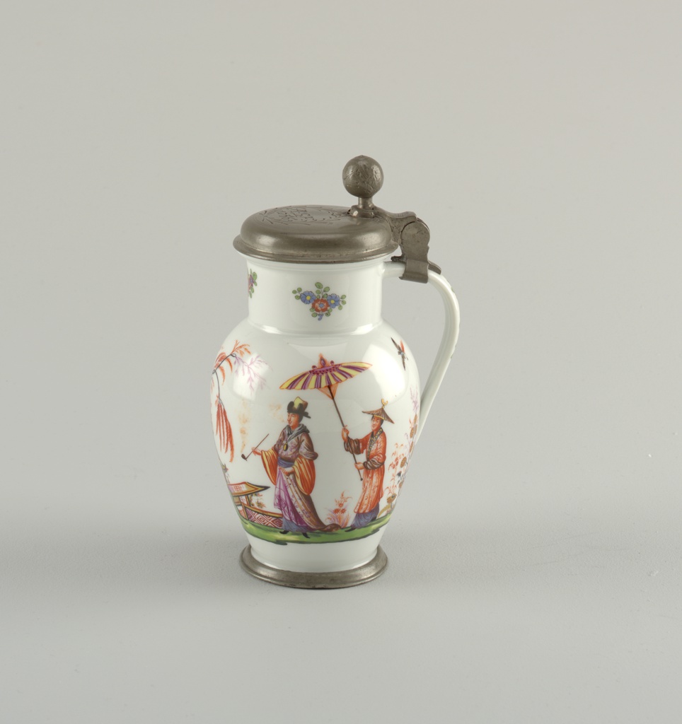 This is a tankard. It was manufactured by Meissen Porcelain Factory and Meissen Porcelain Manufactory and painted by J. G. Horoldt. We acquired it in 1958. Its medium is hard paste porcelain, vitreous enamel, pewter. It is a part of the Product Design and Decorative Arts department.