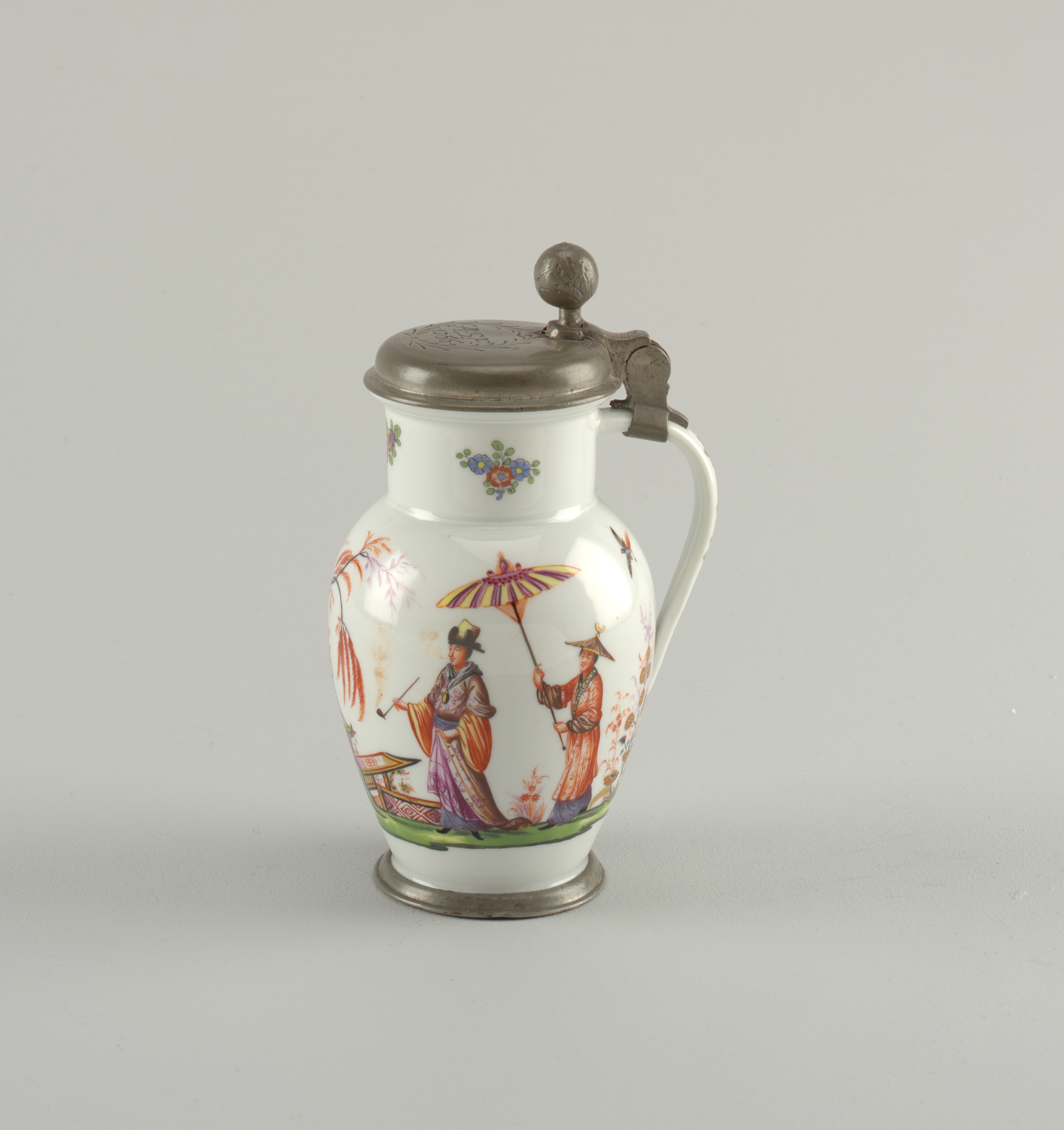 Pewter-Mounted Tankard Tankard; Manufactured by Meissen Porcelain Factory (Germany), Meissen Porcelain Manufactory (Germany); Painted by J. G. Horoldt (German); Germany; hard paste porcelain, vitreous enamel, pewter; H x W x D: 20 × 13 × 10.5 cm (7 7/8 × 5 1/8 × 4 1/8 in.); Gift of R. Thornton Wilson; 1958-137-3