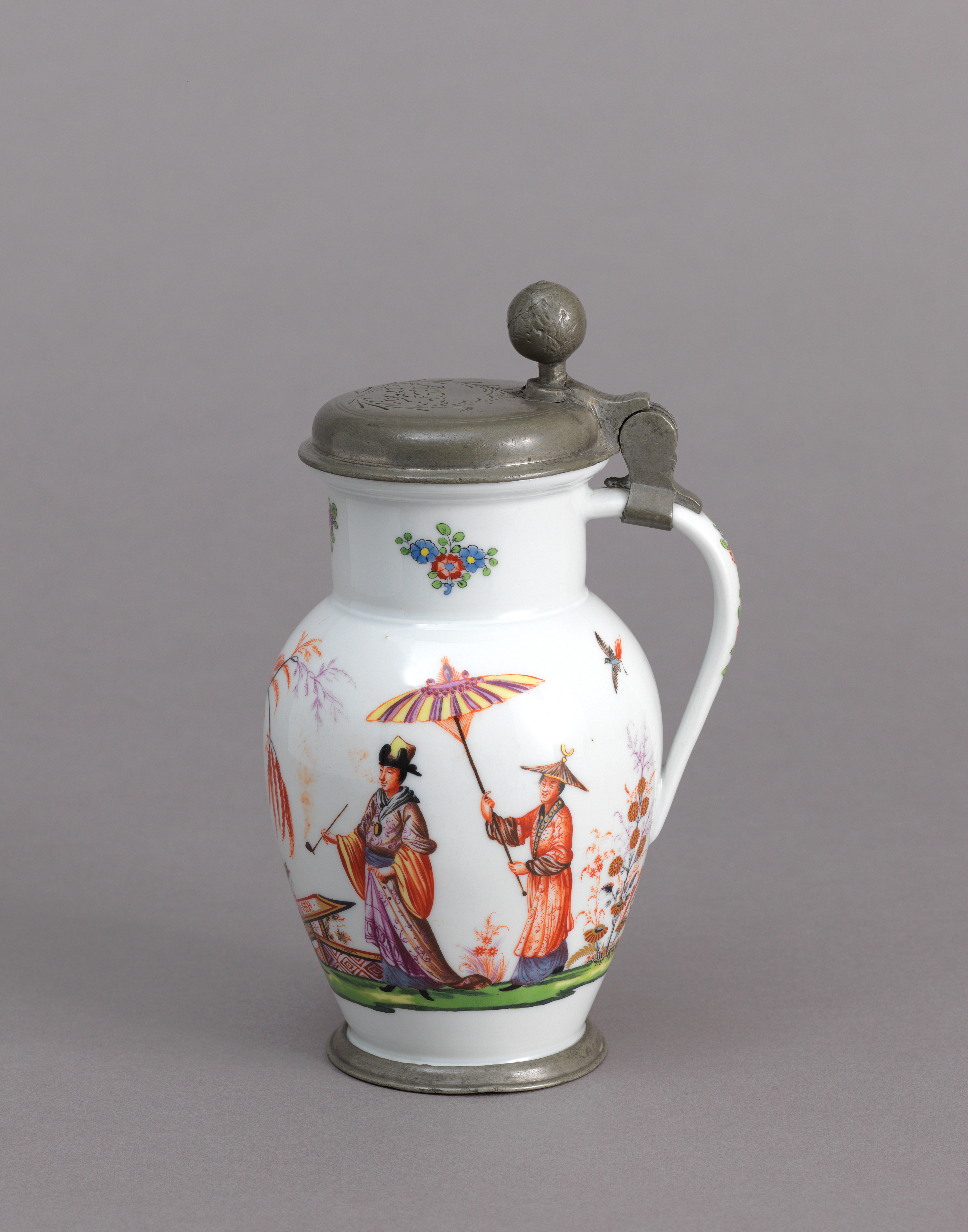 Pewter-Mounted Tankard Tankard; Manufactured by Meissen Porcelain Factory (Germany), Meissen Porcelain Manufactory (Germany); Painted by J. G. Horoldt (German); Germany; hard paste porcelain, vitreous enamel, pewter; H x W x D: 20 × 13 × 10.5 cm (7 7/8 × 5 1/8 × 4 1/8 in.); Gift of R. Thornton Wilson; 1958-137-3