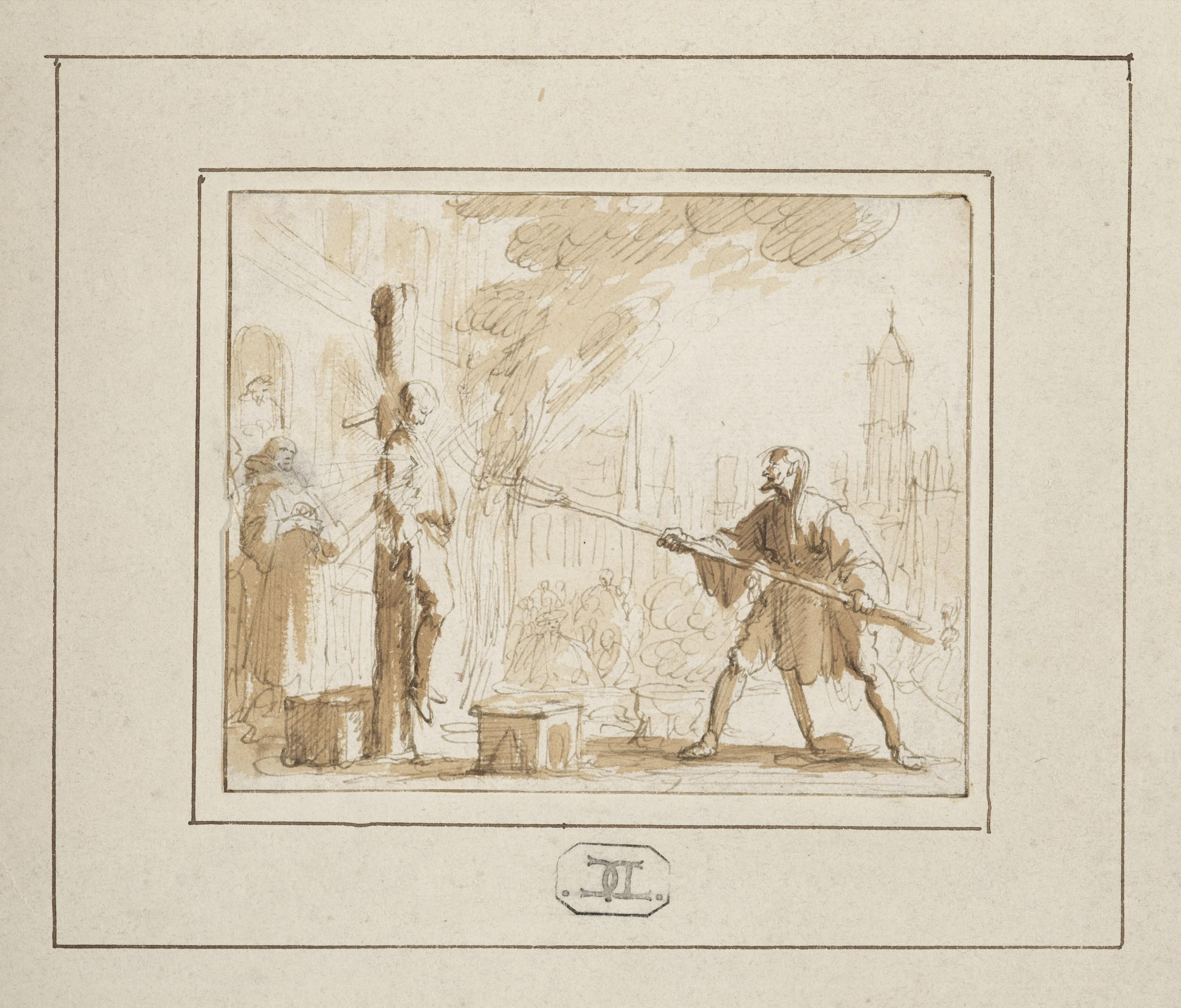 Drawing, The Execution by Gunpowder of Hendrik Eemkens in 1562 in Utrecht, design for illustration in T.J. van Bragt, "Het bloedig tooneel, of Martelaers spiegel der doopsgesinde of weereloose christenen (The Mirror of Martyrs), 1685.