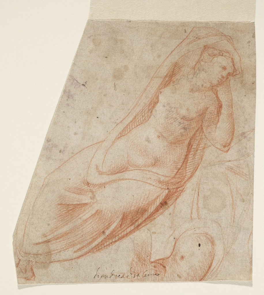 Drawing, Semi-Draped Female Figure; Italy; red chalk on paper; 15.2 x 14 cm (6 in. x 5 1/2 in.), irregular; Gift of Hugh Cassel; 1958-143-65