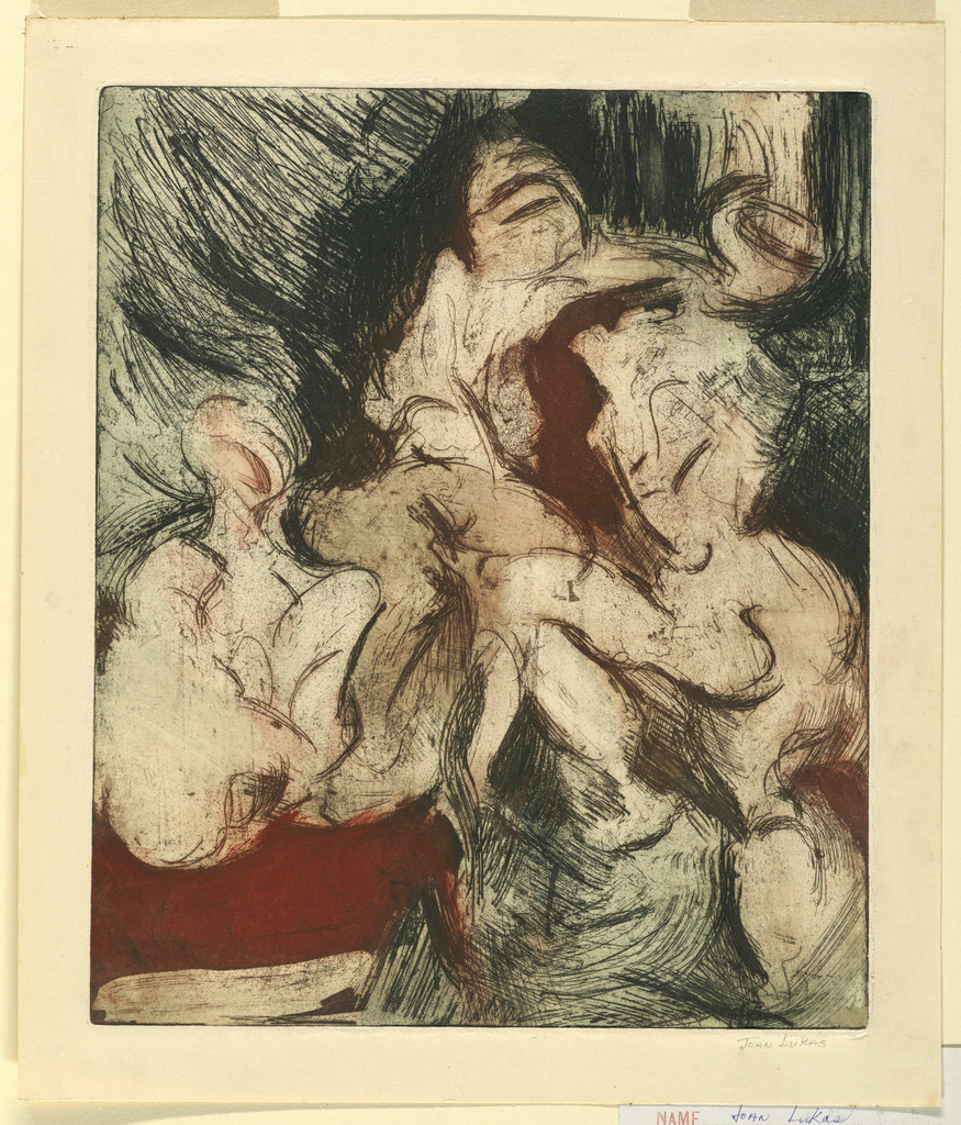 This is a Print. It was created by Joan Lukas. It is dated 1958 and we acquired it in 1958. Its medium is red and green inks on white paper. It is a part of the Drawings, Prints, and Graphic Design department.