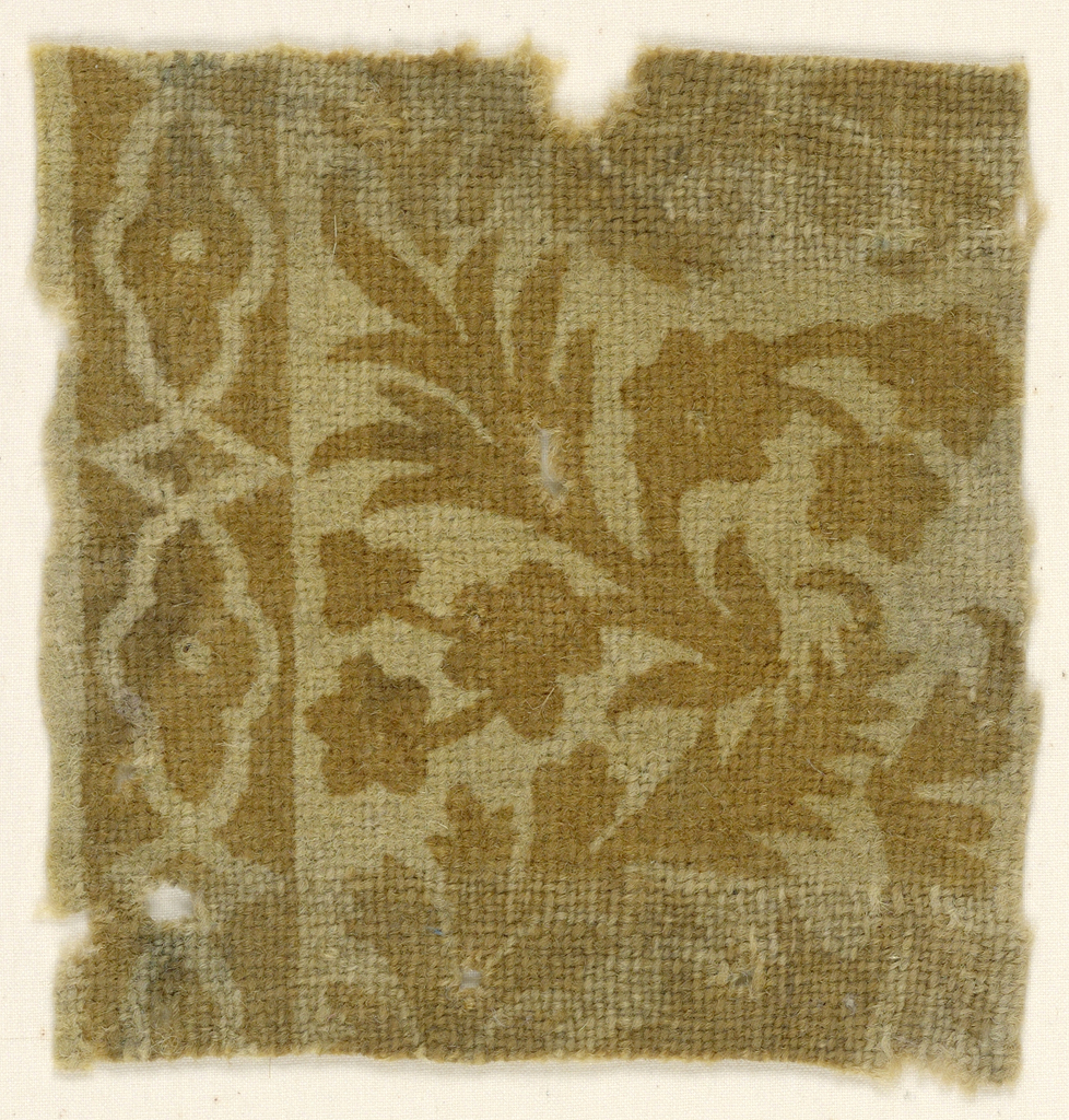 This is a Fragment. It is dated 16th–17th century and we acquired it in 1959. Its medium is wool and its technique is block printed on plain weave. It is a part of the Textiles department.