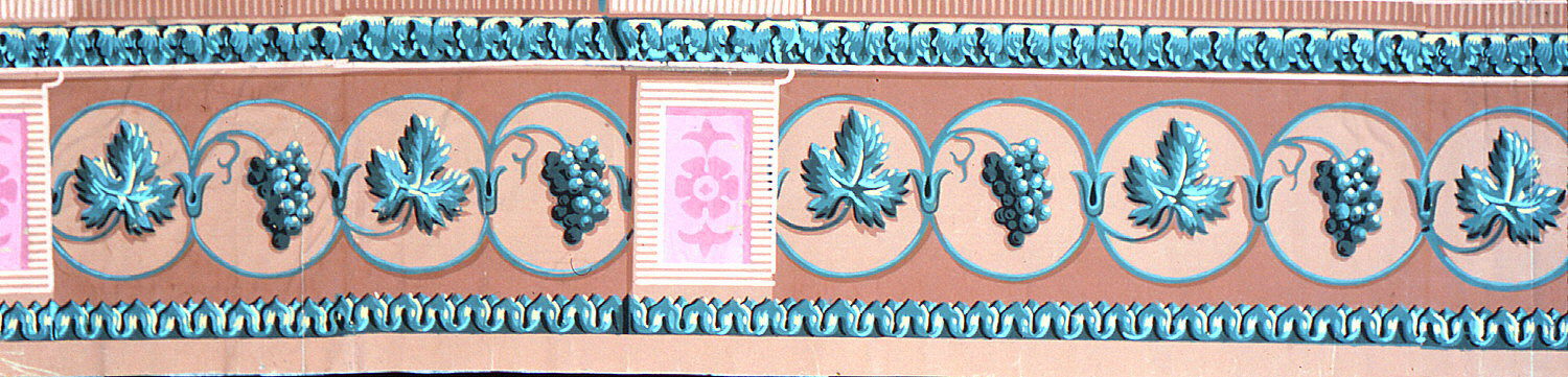 This is a Border. It was manufactured by Jacquemart & Bénard. It is dated 1800–1830 and we acquired it in 1959. Its medium is block-printed on handmade paper. It is a part of the Wallcoverings department.