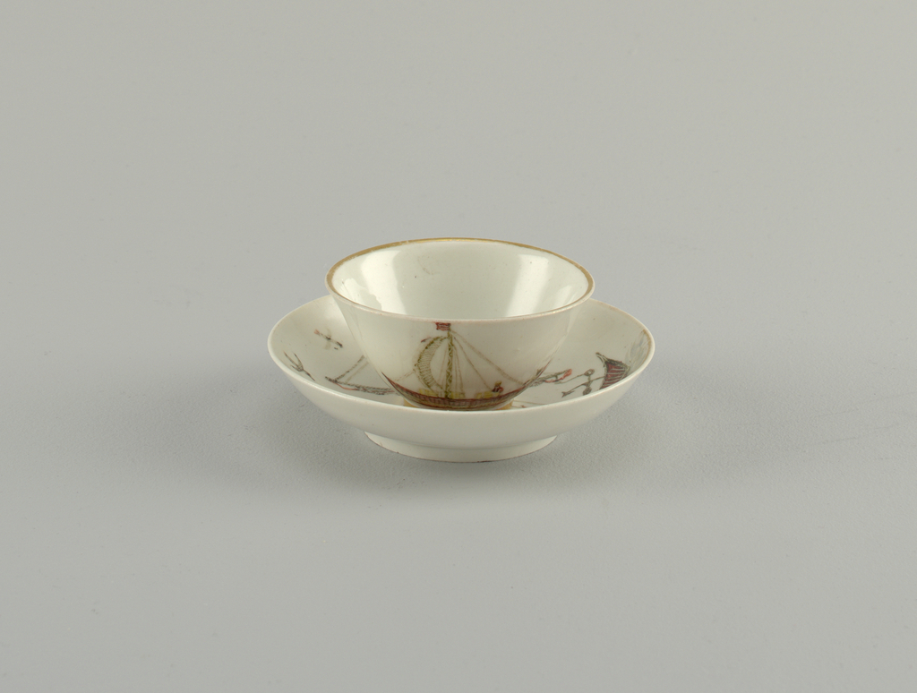 This is a cup and saucer. It was possibly by Meissen Porcelain Manufactory. It is dated early 18th century and we acquired it in 1959. Its medium is porcelain, vitreous enamel, gold. It is a part of the Product Design and Decorative Arts department.
