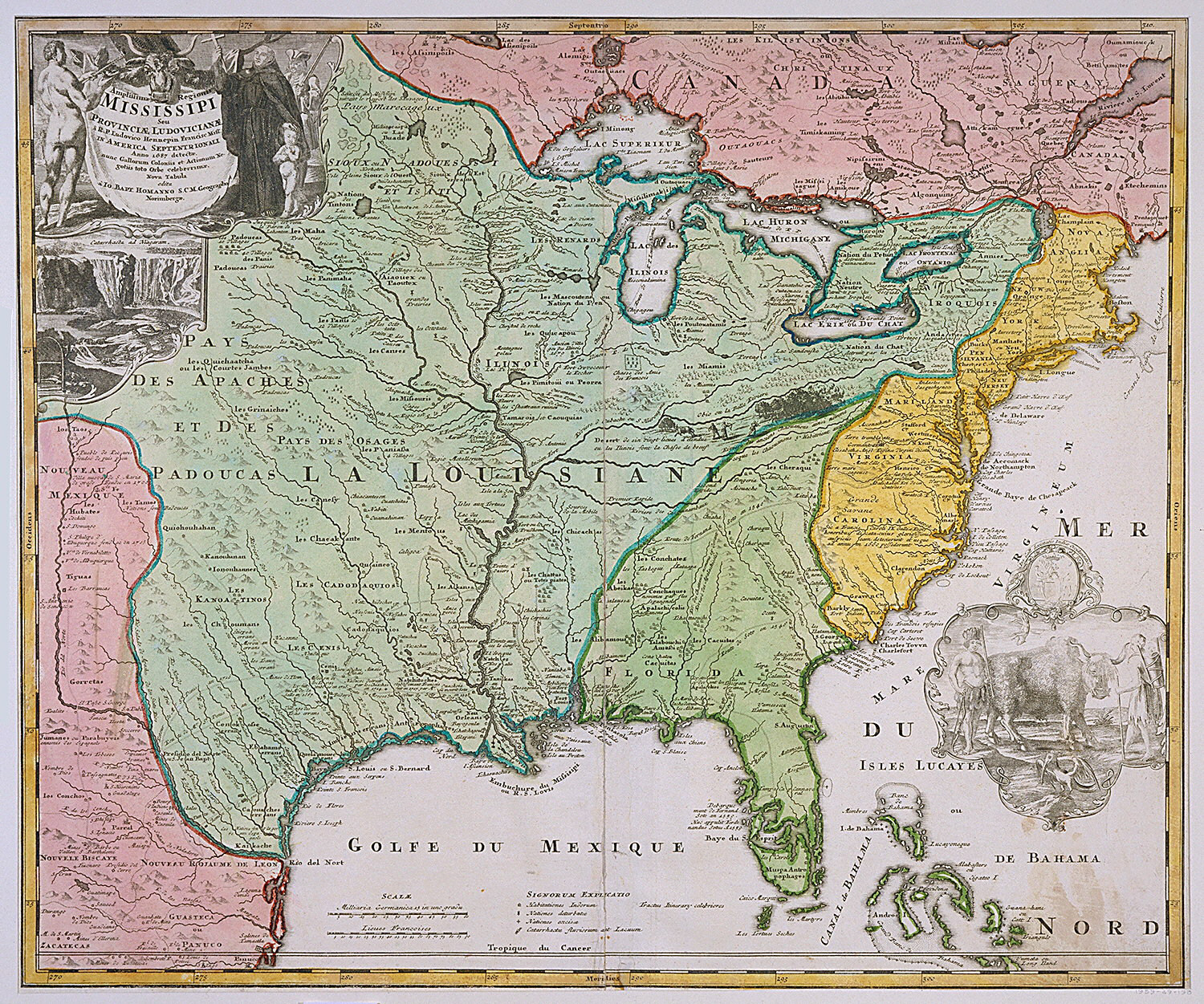Inscribed in plate, at upper right in escutcheon: Amplissimae Regionis/ MISSISSIPPI/ Seu/ PROVINCIAE LUDOVICIANAE/ a R.P. Ludovico Hennepin Francise Miss. / IN AMERICA SEPTENTRIONALI / Anno 1687 detectae. / nunc Gallorum Coloniis et Actionum Ne- /gotiis toto Oebe celeberrimae, / Nova Tabula / editu / a IO. BAPT HOMANNO S.C.M. Geographo / Norimbergae.