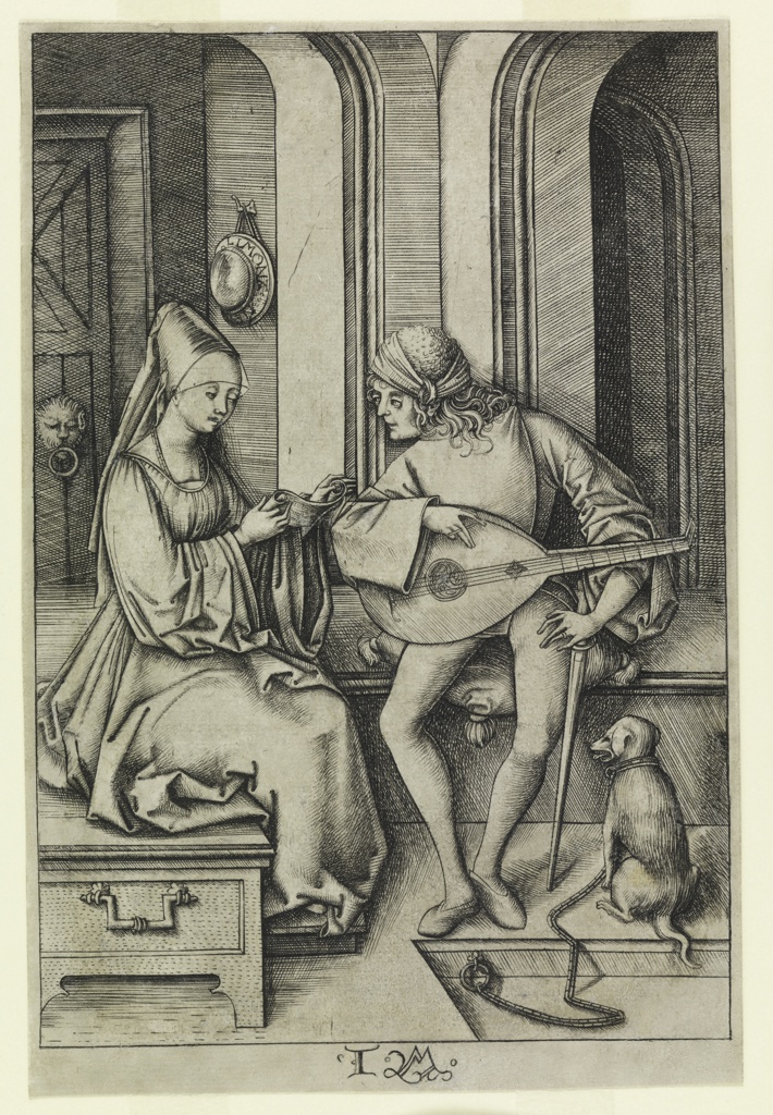 Print, The Lute Player and the Singer (2nd state); Print Maker: Israhel van Meckenem (German, ca. 1440 - 1503); Germany; engraving on off-white laid paper; Overall: 17.2 x 11.4 cm (6 3/4 x 4 1/2 in.); Gift of Mrs. Leo Wallerstein; 1959-72-2
