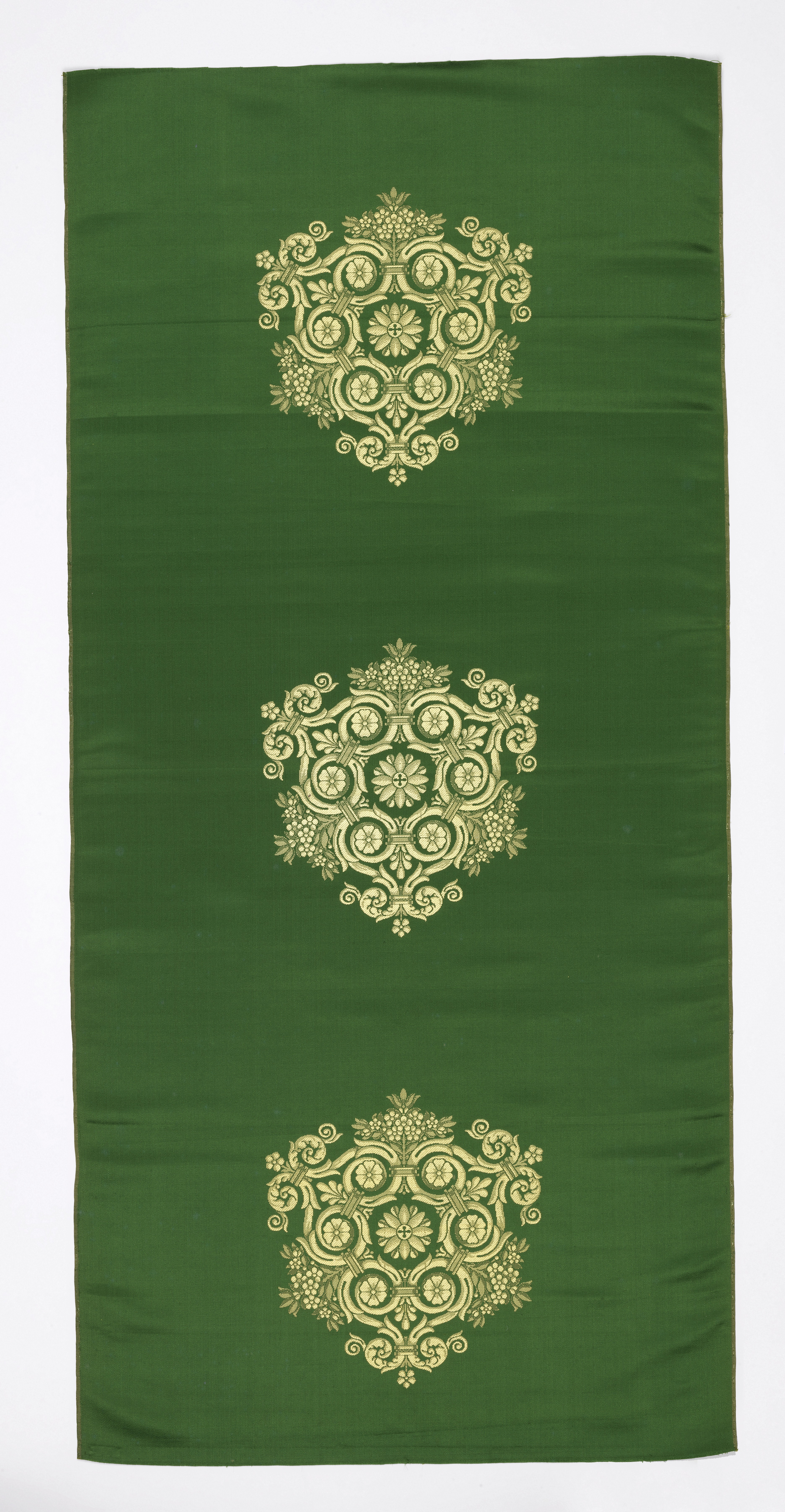 This is a Textile. It is dated ca. 1840 and we acquired it in 1959. Its medium is silk and its technique is satin patterned by continuous supplementary weft. It is a part of the Textiles department.