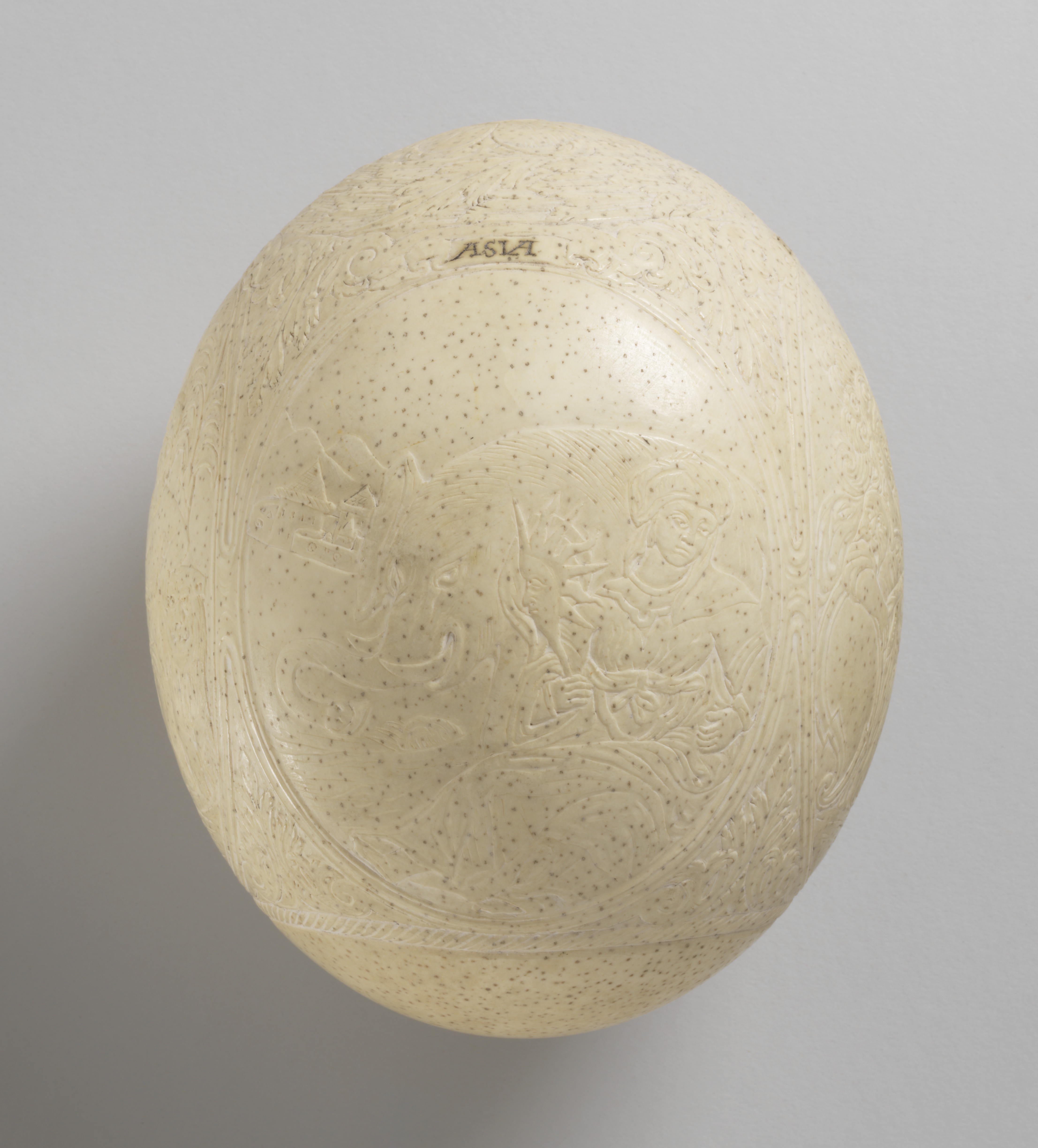 This ostrich egg is carved with allegorical figures representing the Four Continents—Europe, Asia, Africa, and America—a subject that originated in sixteenth-century drawings and prints and that later gained popularity in the decorative arts.[1] The collection of the late James Hazen Hyde, from which the ostrich egg comes, comprised hundreds of objects and prints depicting the Four Continents. Following Hyde’s death in 1959, his collection was divided among The Metropolitan Museum of Art, the Brooklyn Museum, and the Cooper Union Museum for the Arts of Decoration (now, Cooper Hewitt, Smithsonian Design Museum).