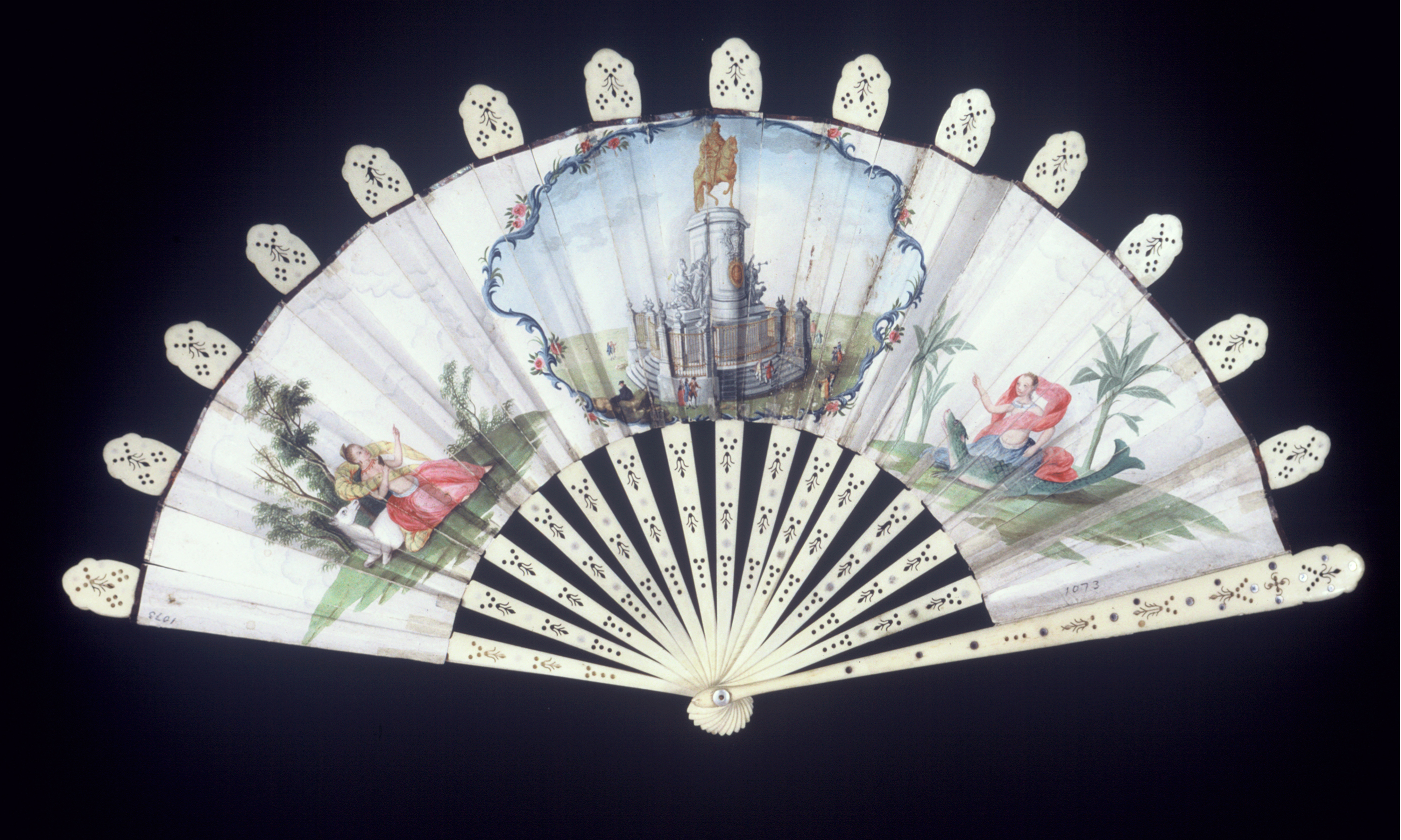 This is a Pleated fan. It is dated late 18th century and we acquired it in 1960. Its medium is painted paper leaf, pierced bone sticks with steel piqués, mother-of-pearl washer. It is a part of the Textiles department.