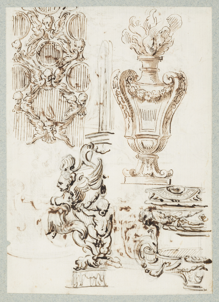 Album Page, A Pierced Screen, Urn, a Fountain and Two Basins; Designed by Gilles-Marie Oppenord (French, 1672–1742); France; pencil, pen and brown ink and brown wash; verso: pen and brown ink with grey wash; H x W: 209 × 151 cm (6 ft. 10 5/16 in. × 59 7/16 in.); Museum purchase through gift of Eleanor and Sarah Hewitt; 1960-102-7