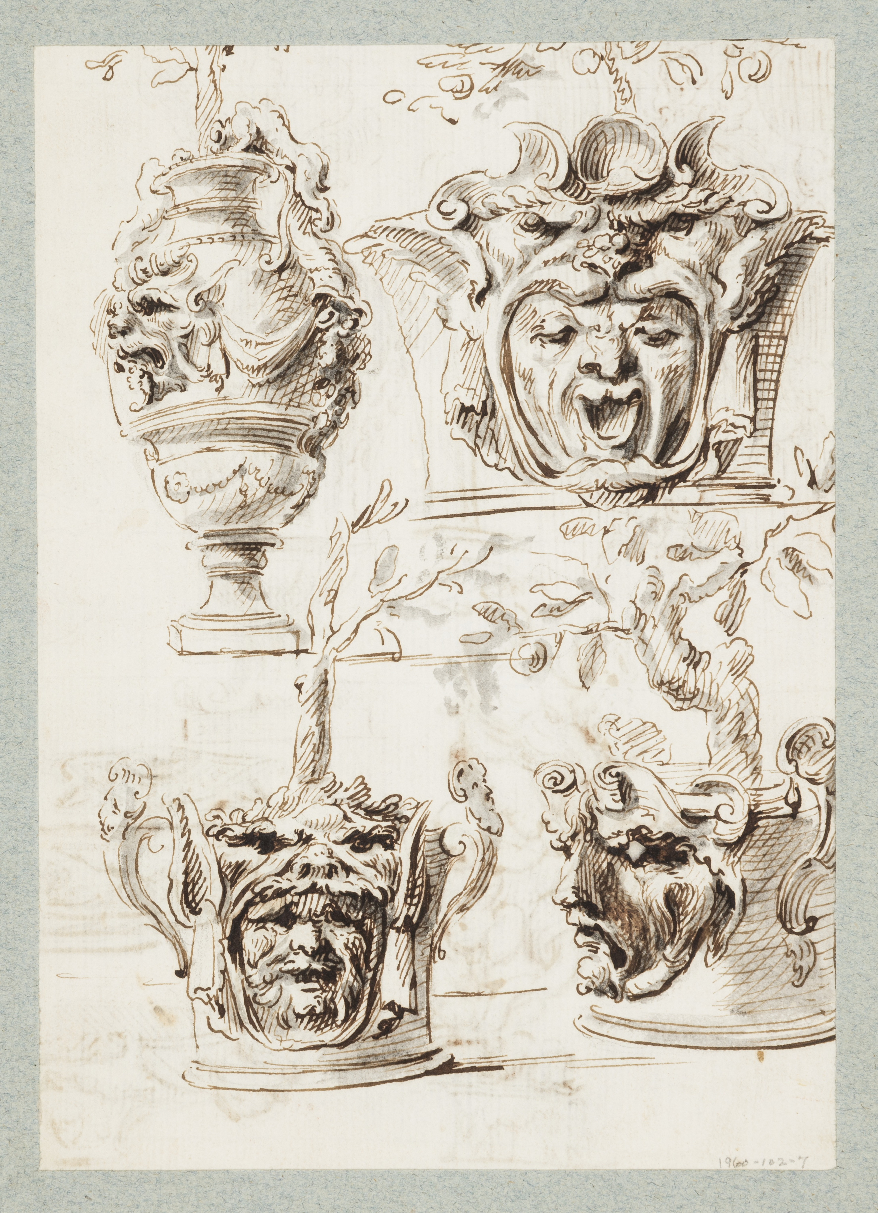 This is a Album page. It was designed by Gilles-Marie Oppenord. It is dated 1692–99 and we acquired it in 1960. Its medium is pencil, pen and brown ink and brown wash; verso: pen and brown ink with grey wash. It is a part of the Drawings, Prints, and Graphic Design department.