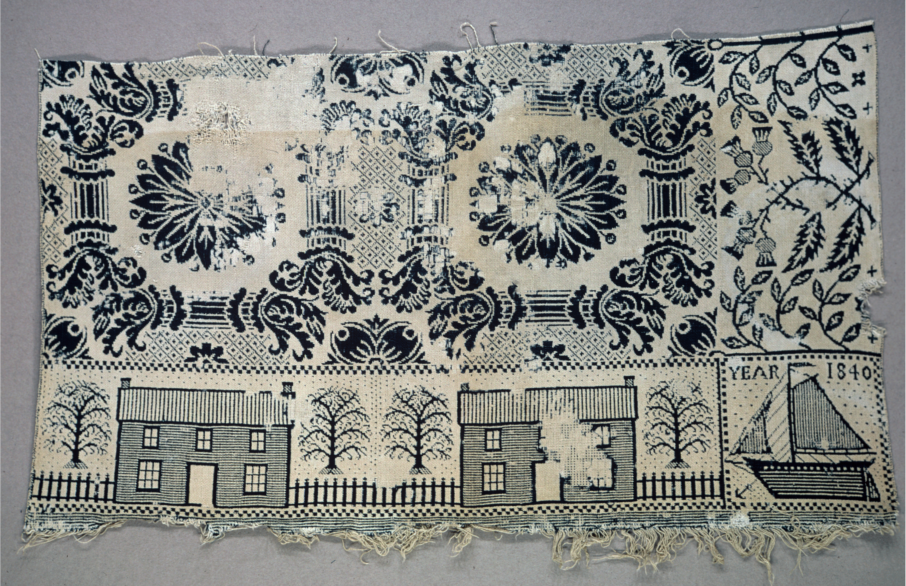 This is a Coverlet fragments. It is dated 1840 and we acquired it in 1960. Its medium is cotton, wool and its technique is double cloth. It is a part of the Textiles department.