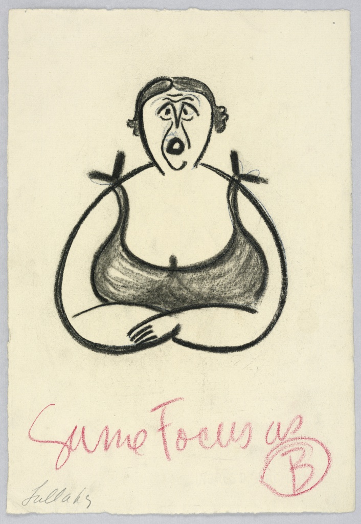 This is a Drawing. It was designed by Christina Malman and made for (as the client) Cue Magazine. It is dated 1934–39 and we acquired it in 1960. Its medium is blue pencil, red crayon, black charcoal, graphite on paper. It is a part of the Drawings, Prints, and Graphic Design department.