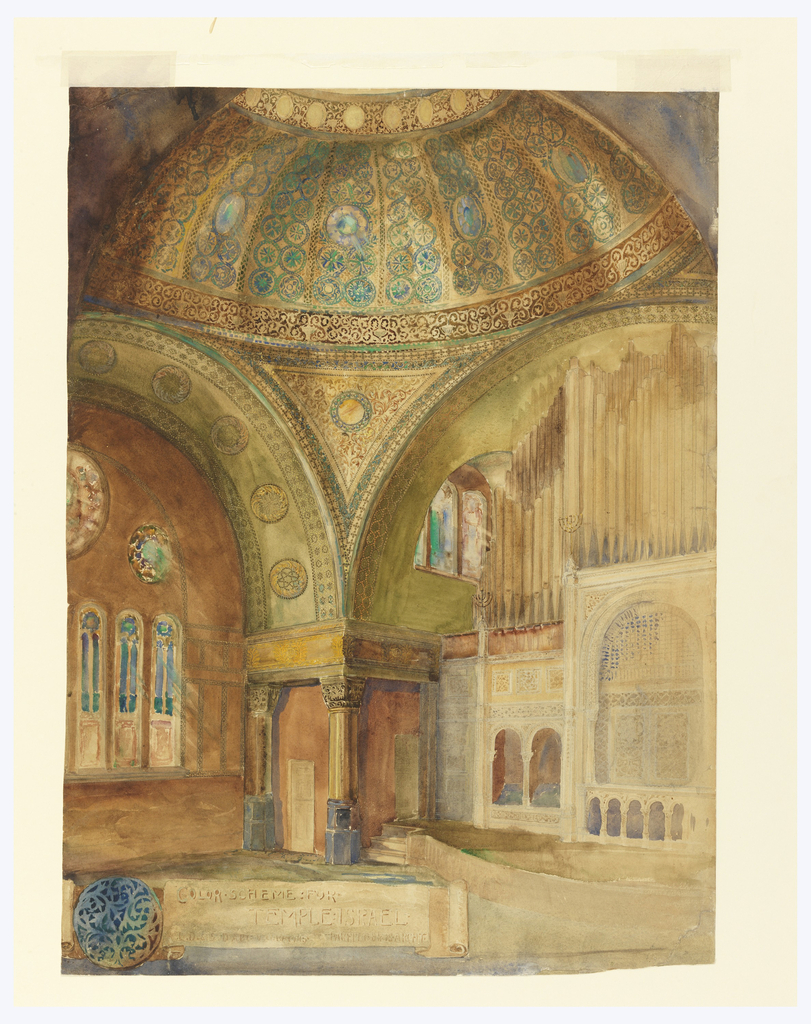 Inscribed in watercolor, lower center: COLOR SCHEME FOR/TEMPLE ISRAEL/L. D. & S. DABO Decorators - Parfitt Bros. Archt.