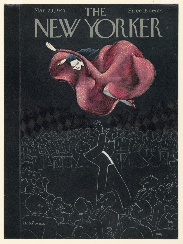 This is a Print. It was designed by Christina Malman and made for (as the client) The New Yorker Magazine. It is dated March 29, 1947 and we acquired it in 1960. Its medium is offset lithograph on paper. It is a part of the Drawings, Prints, and Graphic Design department.
