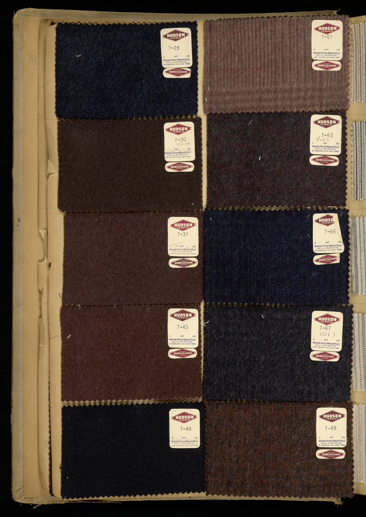 This is a Sample book. It was manufactured by Richard Fensterer and Company, Commodore Woolen Company, Hudson River Fabrics Company and H.G. Moore & Company. It is dated ca. 1920 and we acquired it in 1960. Its medium is clothbound covers, woven wool samples. It is a part of the Textiles department.