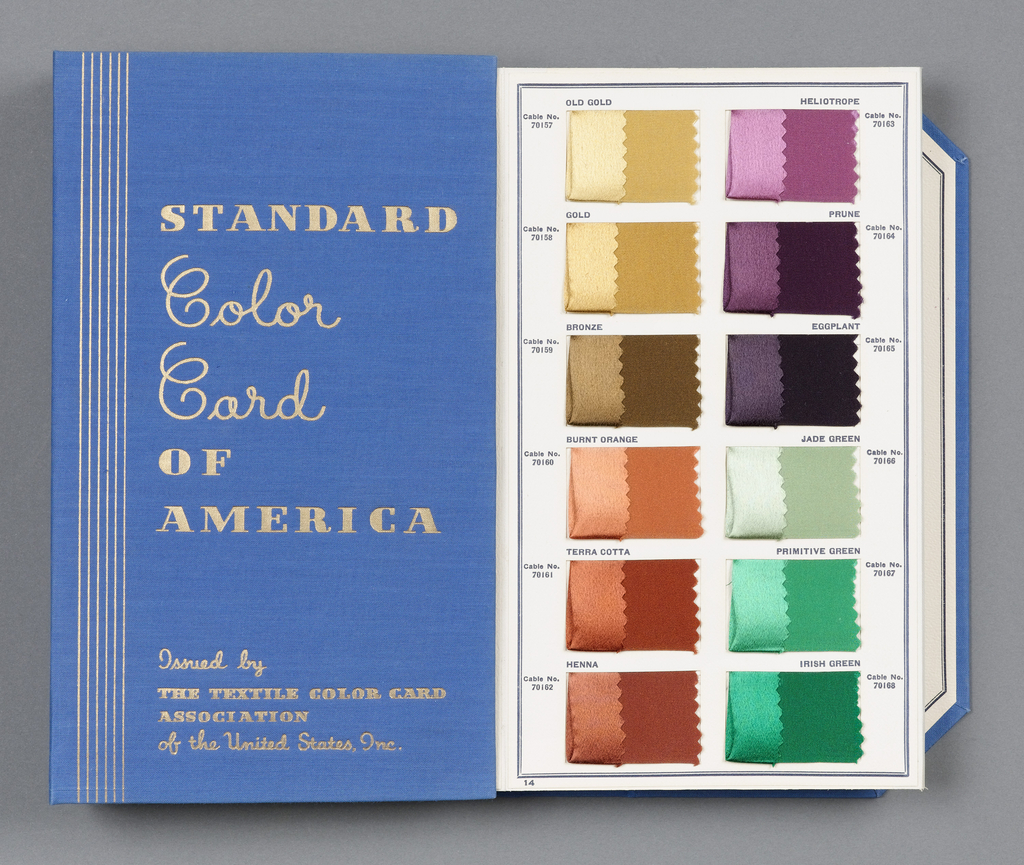 When World War I blocked the import of quality dyes from Germany, American textile, ribbon, leather, straw, and feather manufacturers formed the Textile Color Card Association of the United States to facilitate color coordination across the fashion trades. Subscribers received standard color cards for the spring and fall seasons each year.