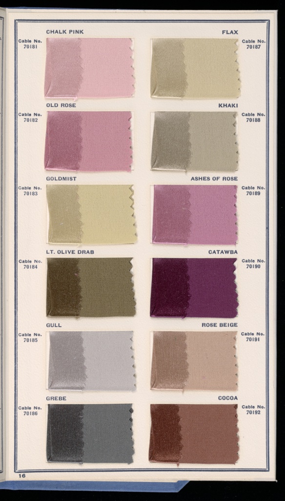 When World War I blocked the import of quality dyes from Germany, American textile, ribbon, leather, straw, and feather manufacturers formed the Textile Color Card Association of the United States to facilitate color coordination across the fashion trades. Subscribers received standard color cards for the spring and fall seasons each year.