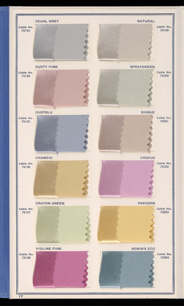 When World War I blocked the import of quality dyes from Germany, American textile, ribbon, leather, straw, and feather manufacturers formed the Textile Color Card Association of the United States to facilitate color coordination across the fashion trades. Subscribers received standard color cards for the spring and fall seasons each year.