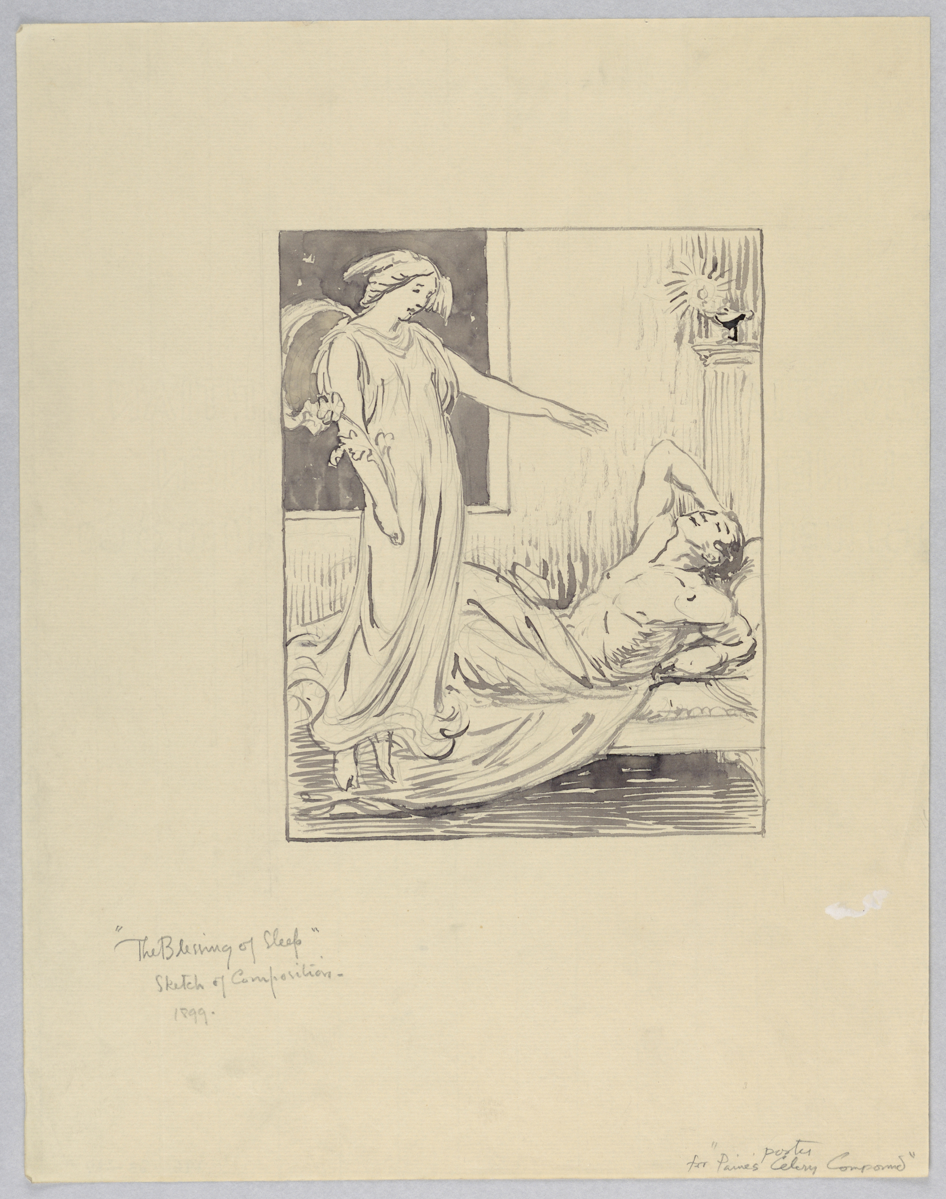 In graphite lower left: The Blessing of Sleep / Sketch of Composition / 1899. In graphite lower right corner: Poster / Paine's Celery Compound