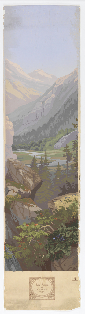 This is a Scenic. It was designed by Schuler, Eugène Ehrmann and Georges Zipélius and manufactured by Zuber & Cie. It is dated 1909 and we acquired it in 1961. Its medium is block-printed paper. It is a part of the Wallcoverings department.