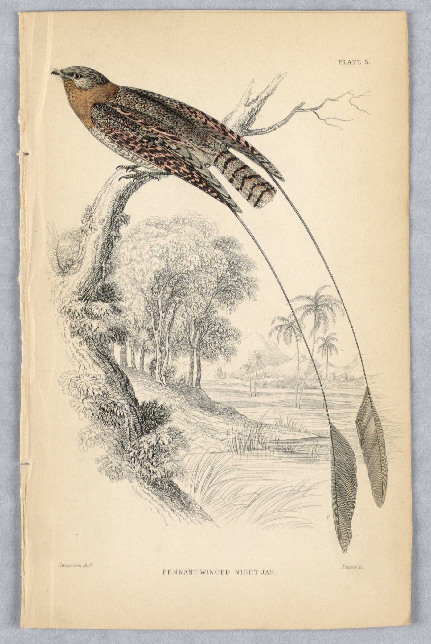 Print, Pennant-Winged Night-Jar, Plate 5 from Birds of Western Africa; Print Maker: William Home Lizars; After William Swainson (British, 1789 - 1855); engraving, brush and watercolor on paper; 16.9 × 10.7 cm (6 5/8 × 4 3/16 in.); Gift of Hamill and Barker; 1961-105-163