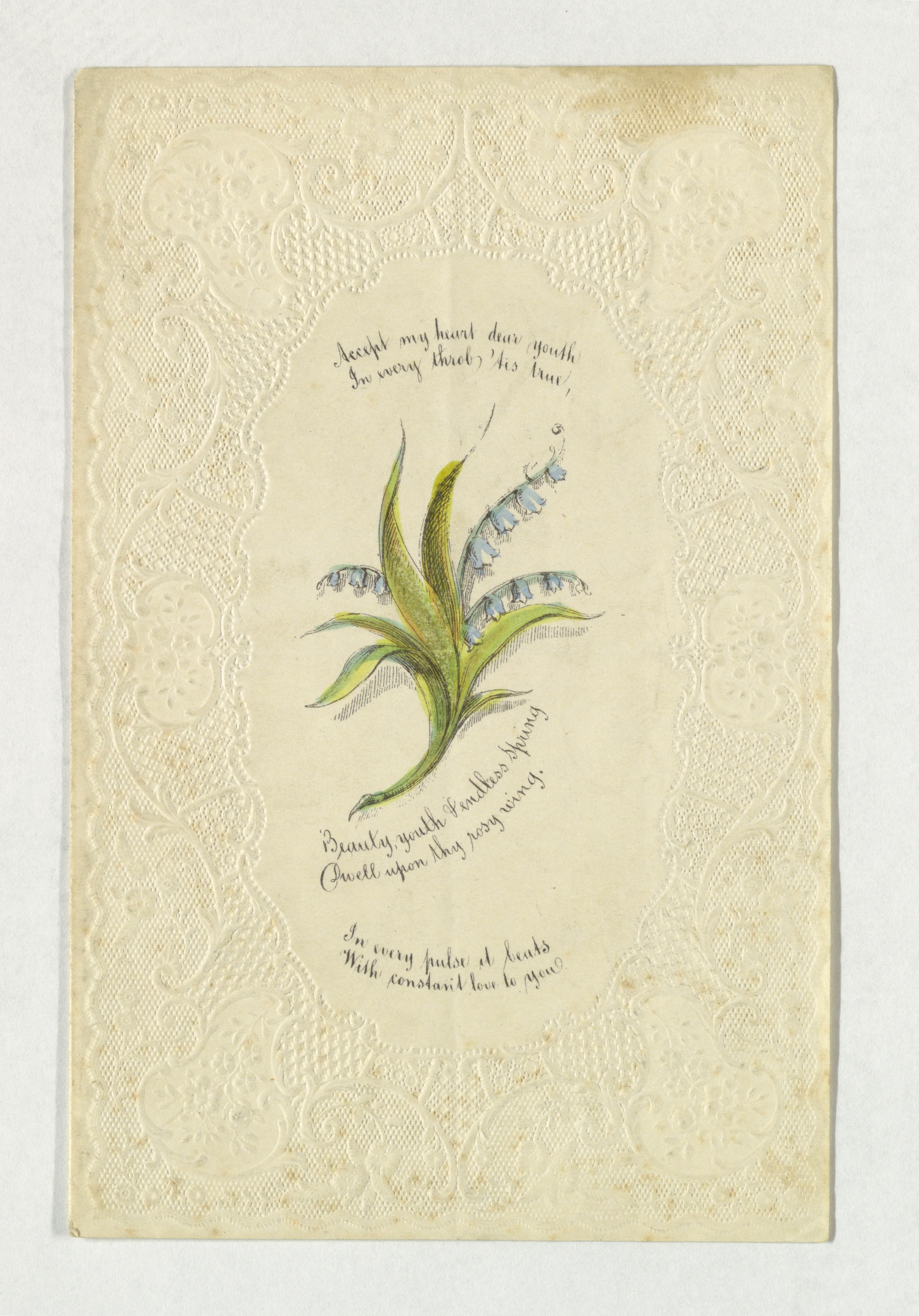 Inscribed, printed in black ink: "Accept my heart dear youth / In every throp 'tis true, / Beauty, youth and endless Spring / Dwell upon thy rosy wing. / In every pulse it beans / with constant love to you".