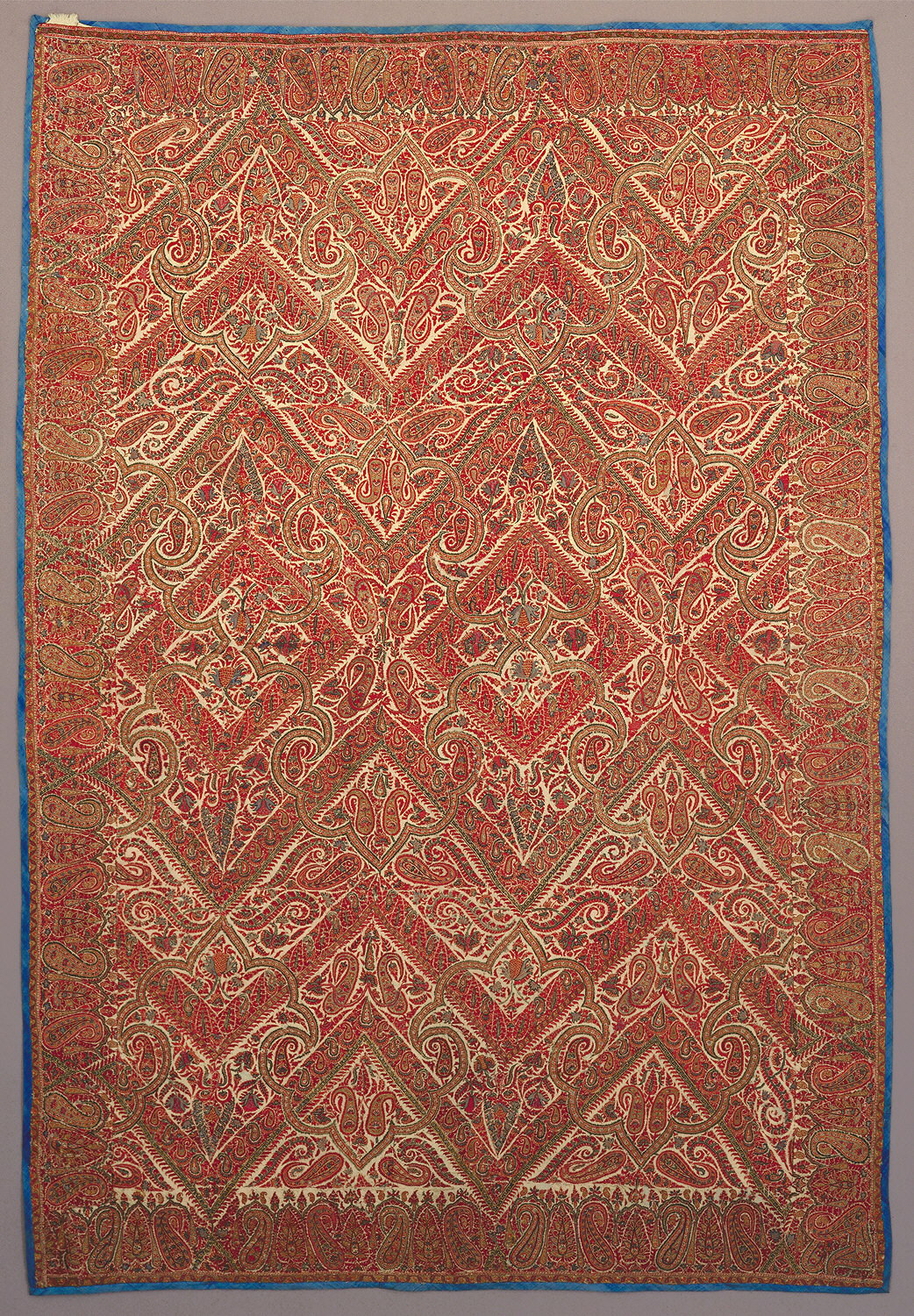 This is a Shawl. It is dated early 19th century and we acquired it in 1961. Its medium is wool and its technique is embroidery on twill ground. It is a part of the Textiles department.