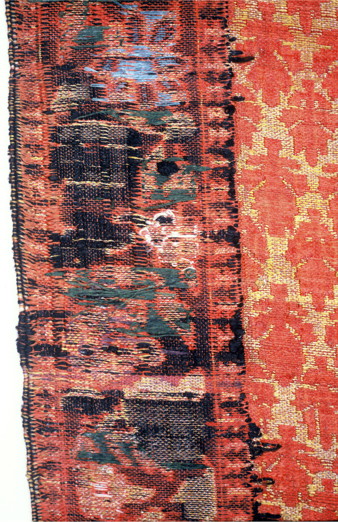 Symmetrical versions of the flowering plant motif were also common in paisley, with stems, buds, flowers, and leaves depicted growing in mirror image around a central stalk. This sash is woven with metal-wrapped threads, which, although tarnished now, would have cast the wearer in shimmering golden light when originally produced in the 19th century.