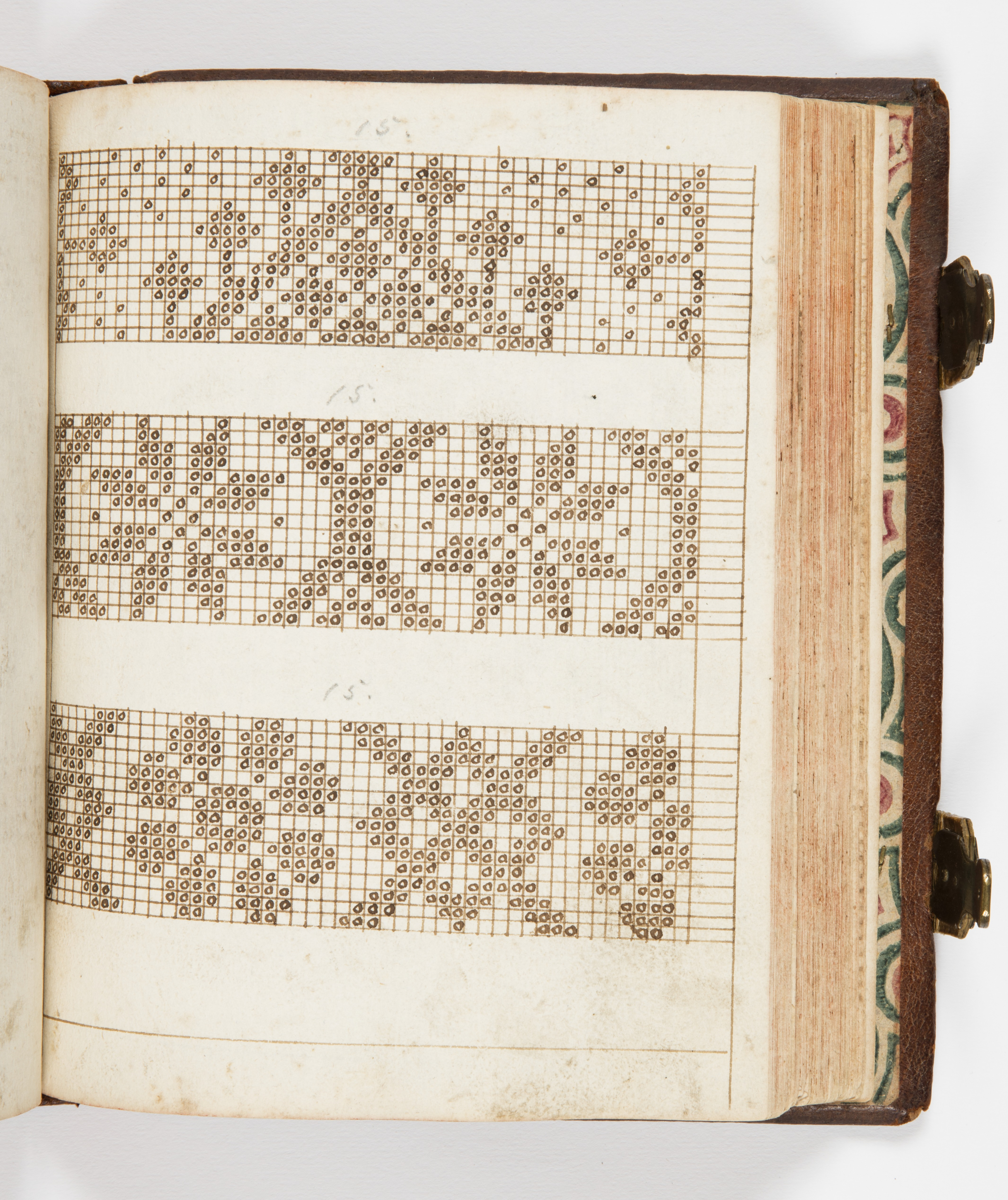 This is a Pattern book. It is dated 1760 and we acquired it in 1961. Its medium is leather, paper, metal. It is a part of the Textiles department.