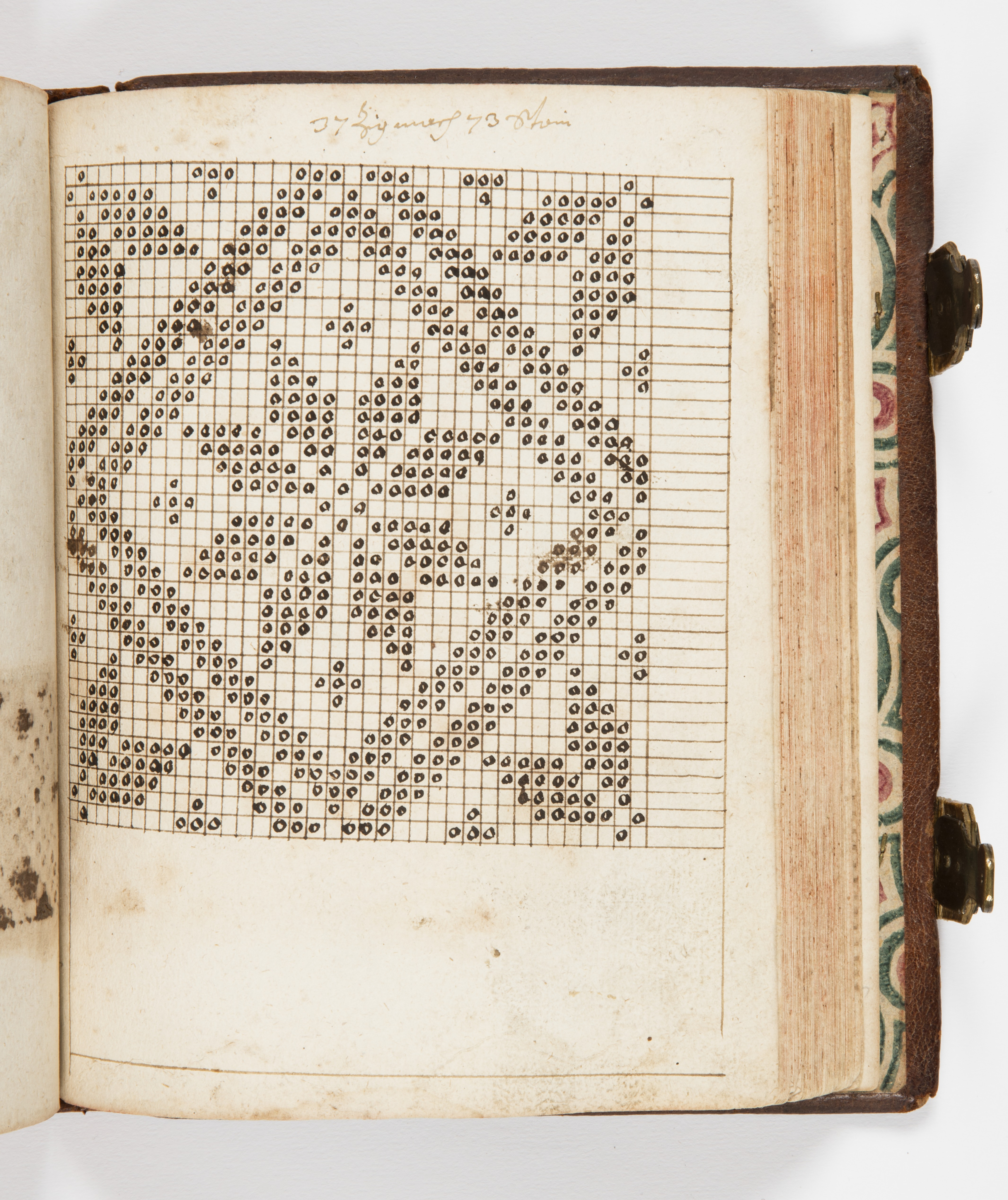 This is a Pattern book. It is dated 1760 and we acquired it in 1961. Its medium is leather, paper, metal. It is a part of the Textiles department.