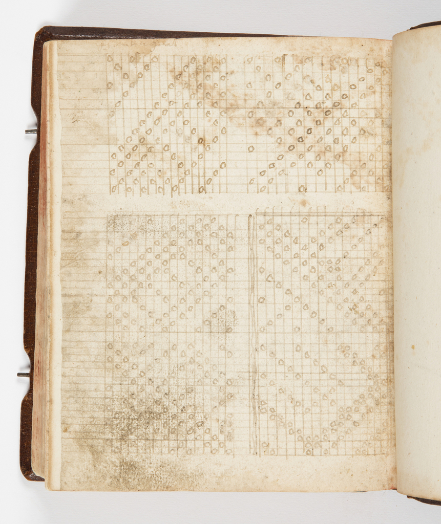 This is a Pattern book. It is dated 1760 and we acquired it in 1961. Its medium is leather, paper, metal. It is a part of the Textiles department.