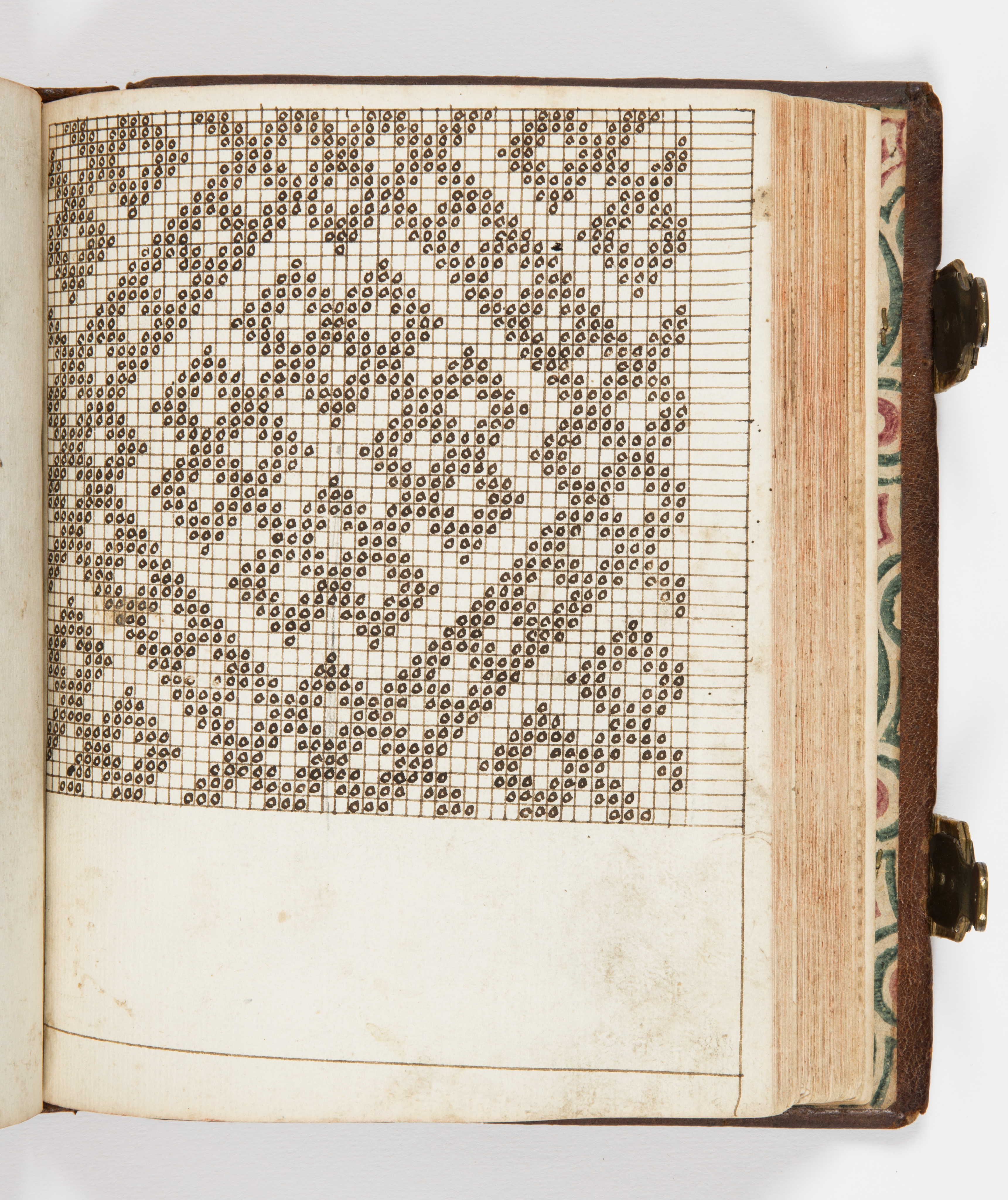 This is a Pattern book. It is dated 1760 and we acquired it in 1961. Its medium is leather, paper, metal. It is a part of the Textiles department.