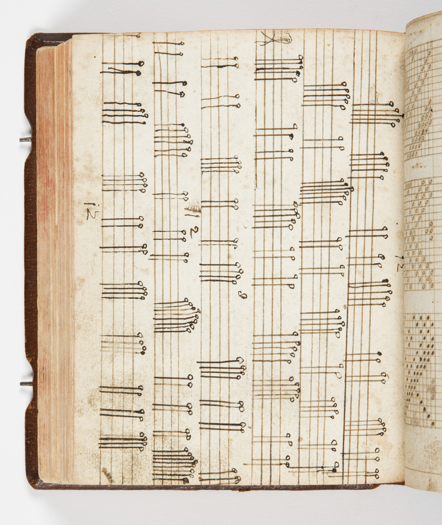 This is a Pattern book. It is dated 1760 and we acquired it in 1961. Its medium is leather, paper, metal. It is a part of the Textiles department.