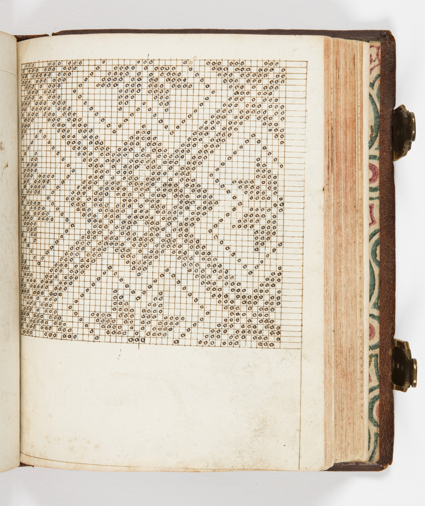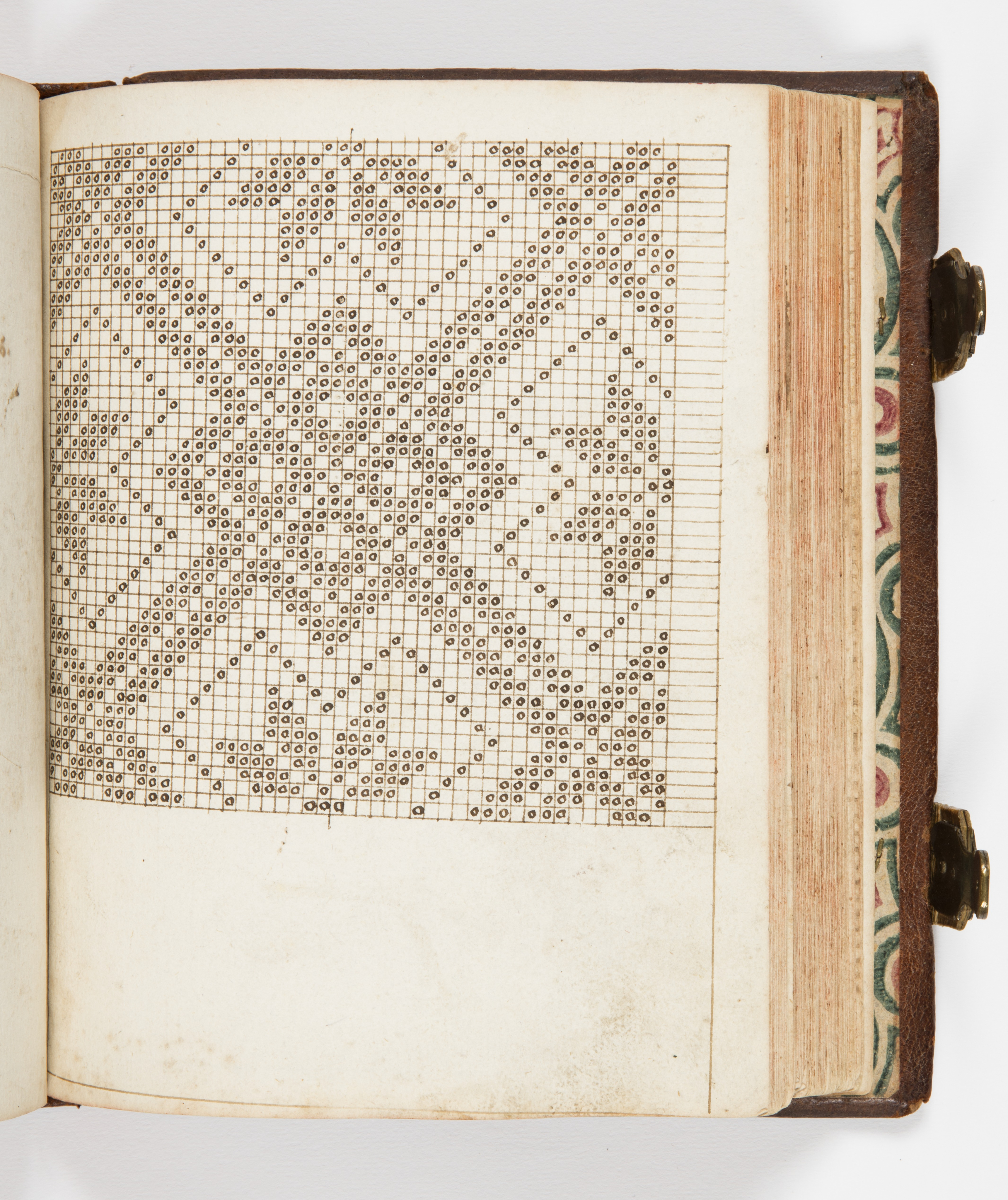 This is a Pattern book. It is dated 1760 and we acquired it in 1961. Its medium is leather, paper, metal. It is a part of the Textiles department.